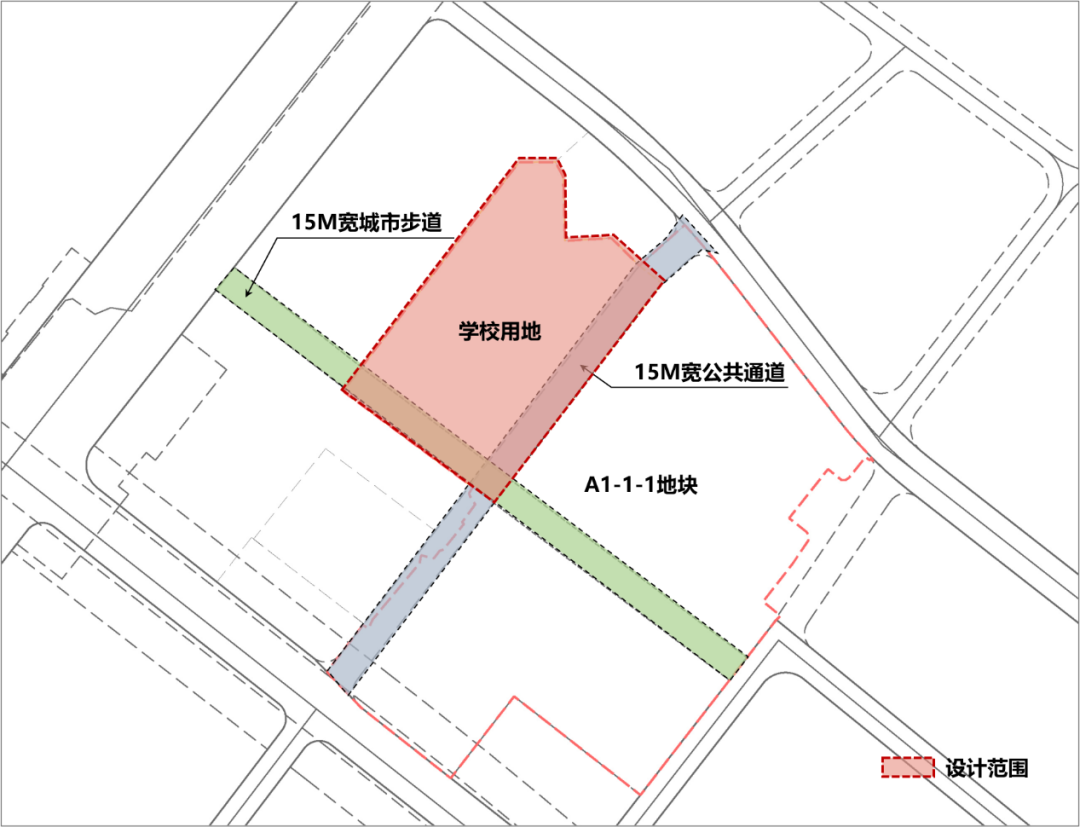学校位于A-1-1地块的西北角,北邻现状电信局,东侧为同一项目住宅地块,南邻规划公共步行走廊,西侧毗邻A-1-2地块。项目用地面积约1.44公顷(含公共通道)。