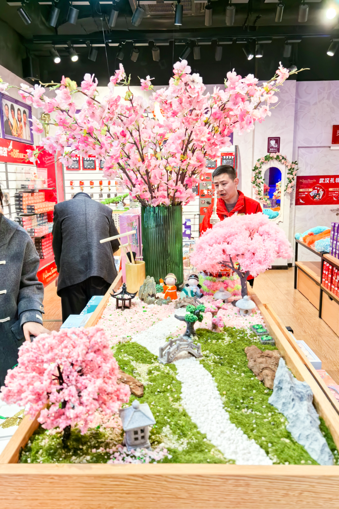 武汉杜莎夫人蜡像馆上新造景,以“武汉礼物”为主题,营造出白云黄鹤、落“樱”缤纷的春景,还有樱花冰箱贴、唐诗三万里钥匙扣等文创周边。游客在文创售卖区可以免费盖到套色章,上面有黄鹤楼、武汉长江大桥、龟山电视塔等地标。