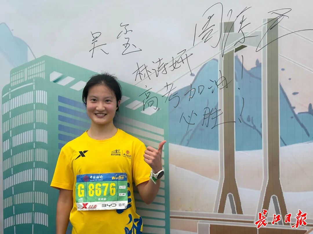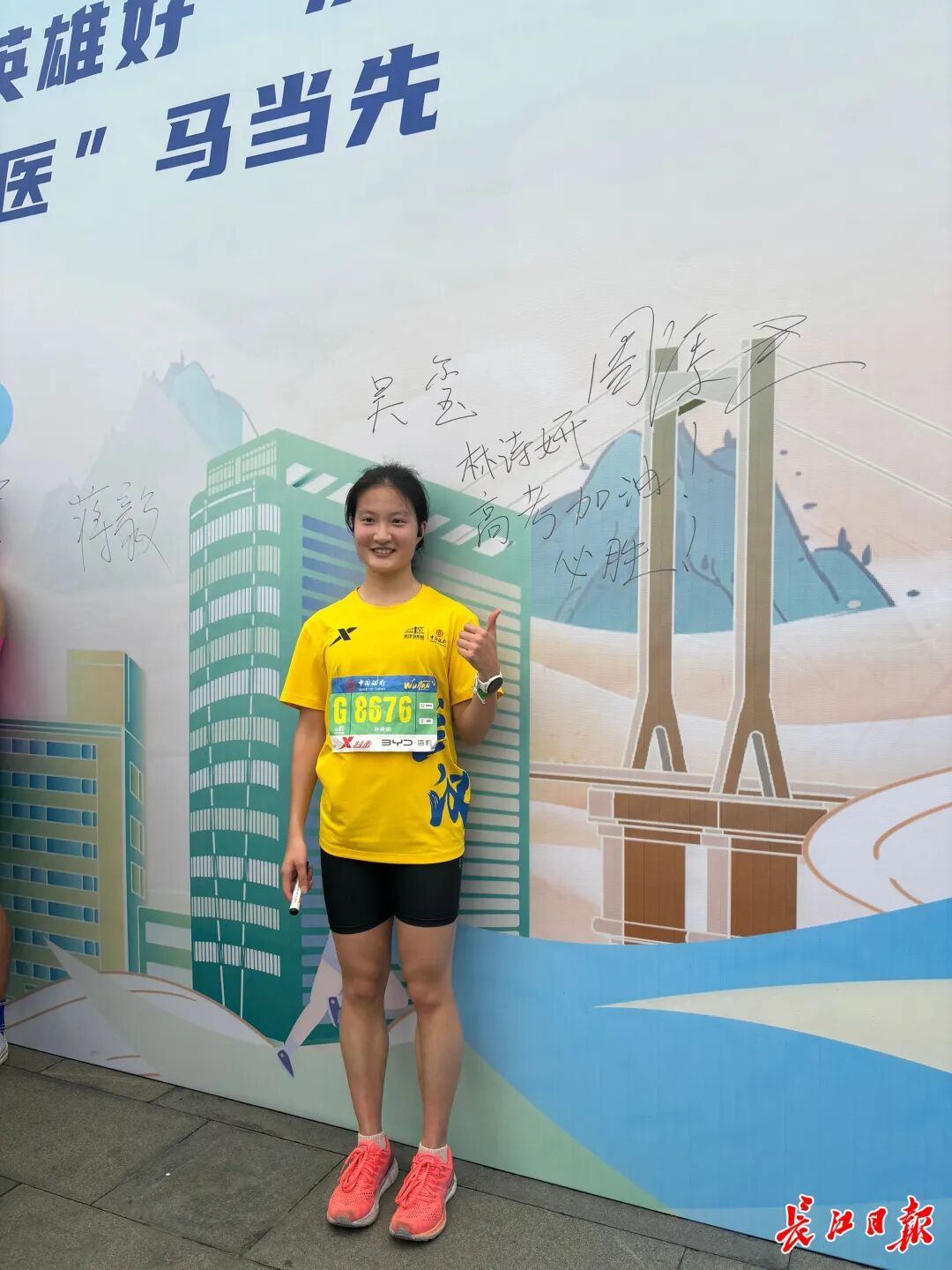 林诗妍完赛后,在健康跑完赛纪念墙上写下“高考加油”的字样。“汉马不服输的精神给我鼓足了劲,也激励着我全力冲刺即将到来的高考。”她激动地说。