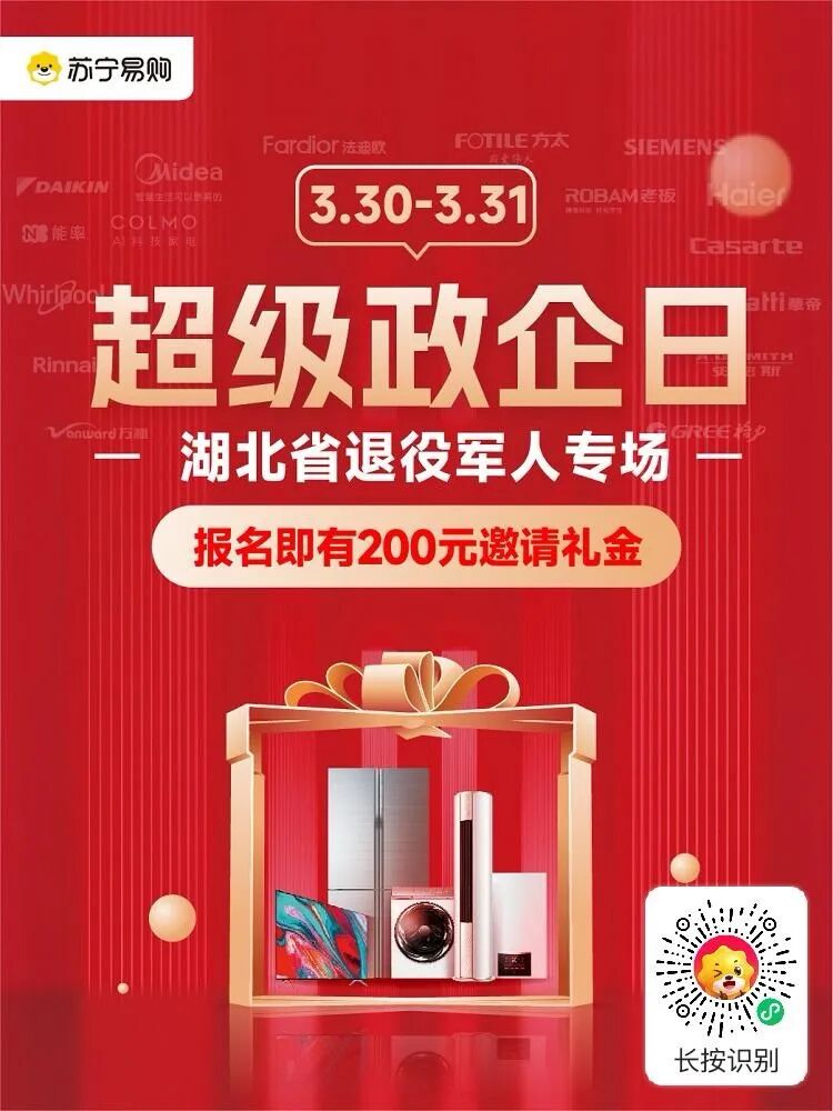 苏宁易购集团于3月30日至31日,在全省门店开展“感恩回馈 致敬退役军人”家电专项补贴工作,对全省退役军人购买手机、电脑、空调、彩电、冰箱、洗衣机、厨房电器等家电进行补贴。此次落地湖北的补贴预算约为1000万元,补贴数量15000台(套)。