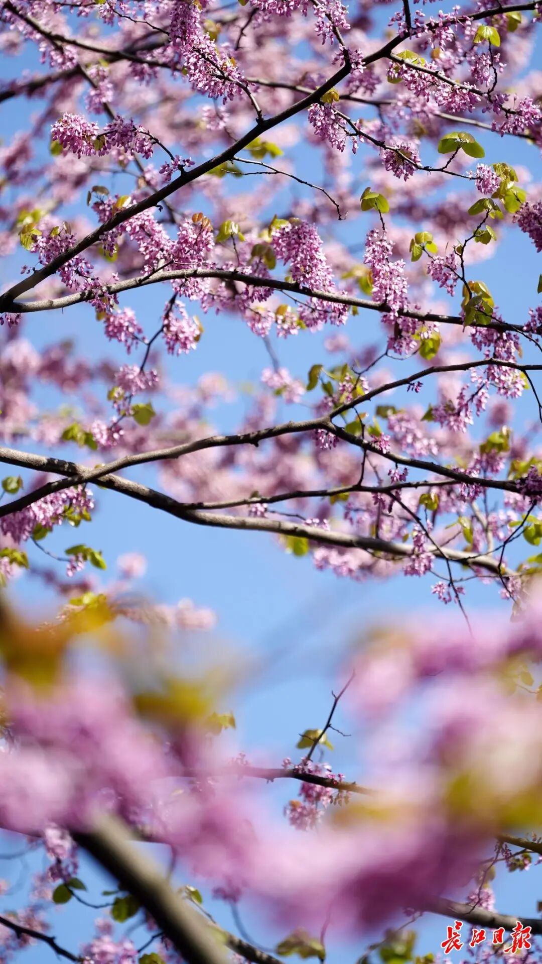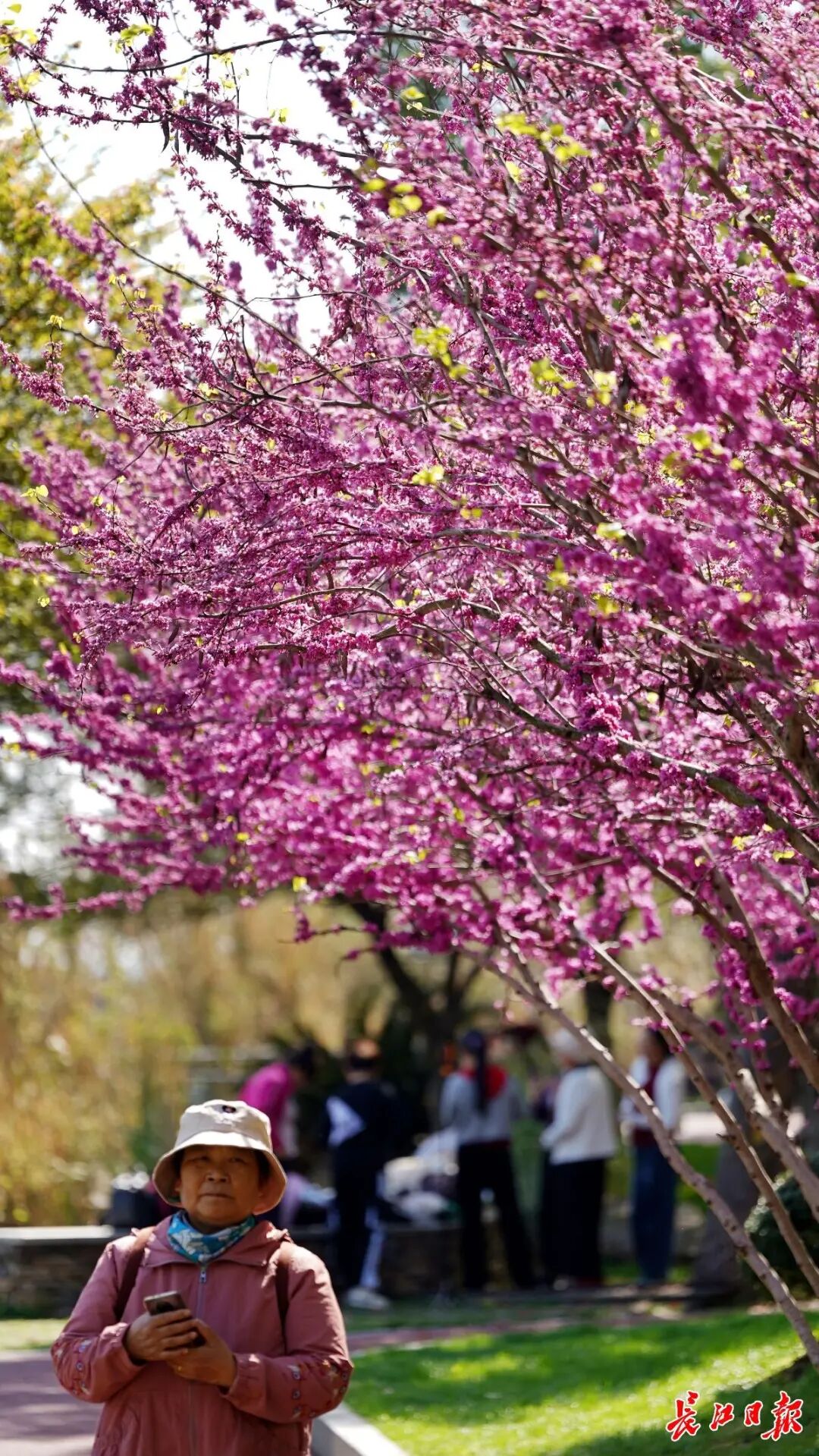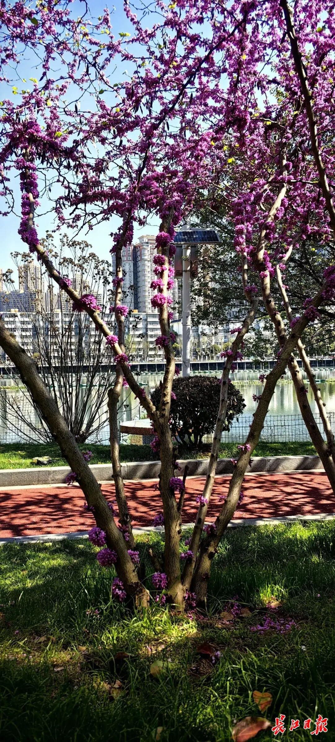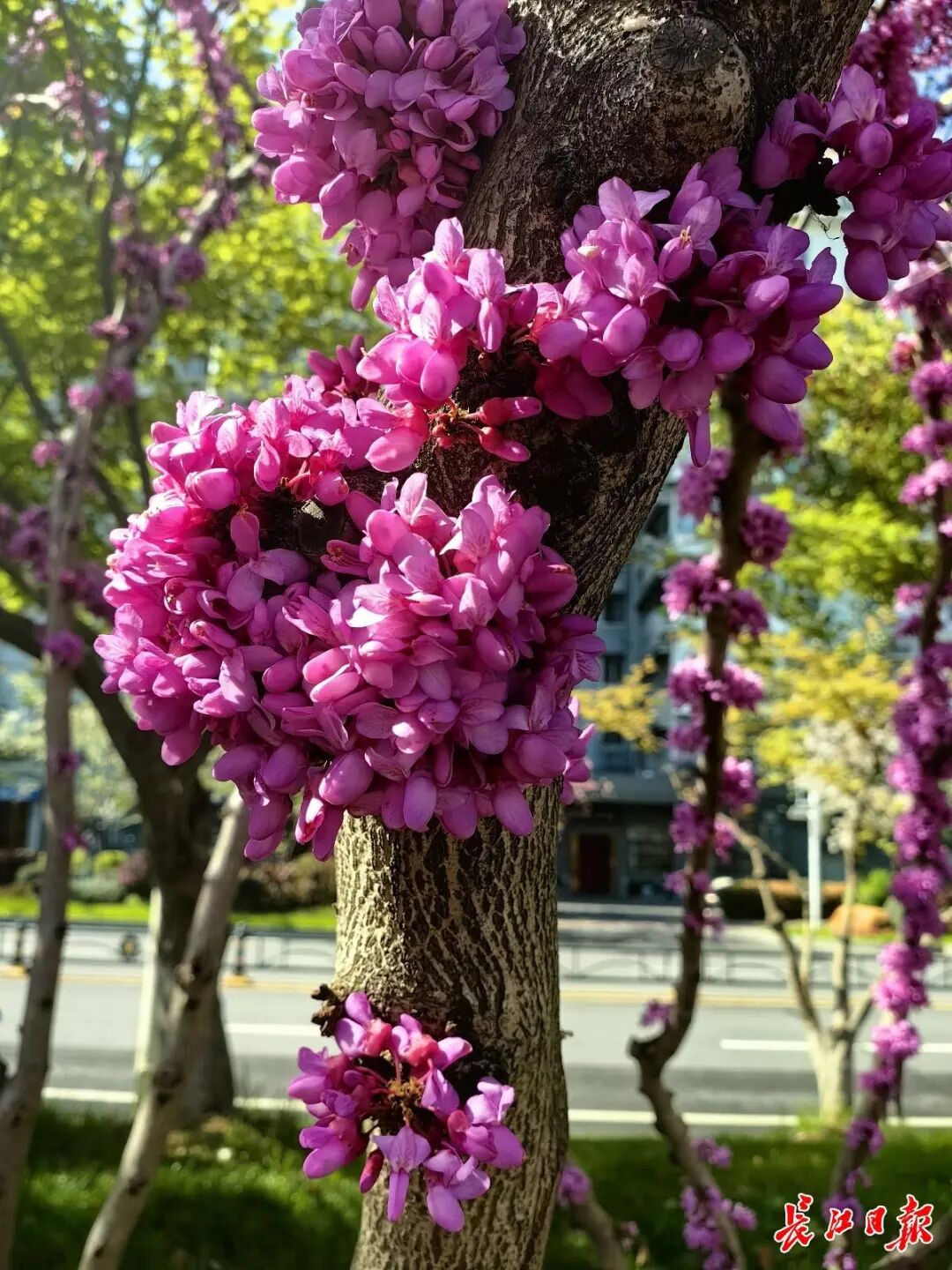 在红叶碧桃附近,长有两种不同的紫荆,一种是巨紫荆,有3株,树高约10米,所有枝条都缀满紫红色花朵,形如一根根细长的花棒。在它的斜对面长着3株本土紫荆,树高只有四五米,也是繁花满树。其中一株从头到脚都在开花,这样的花树难得一见。