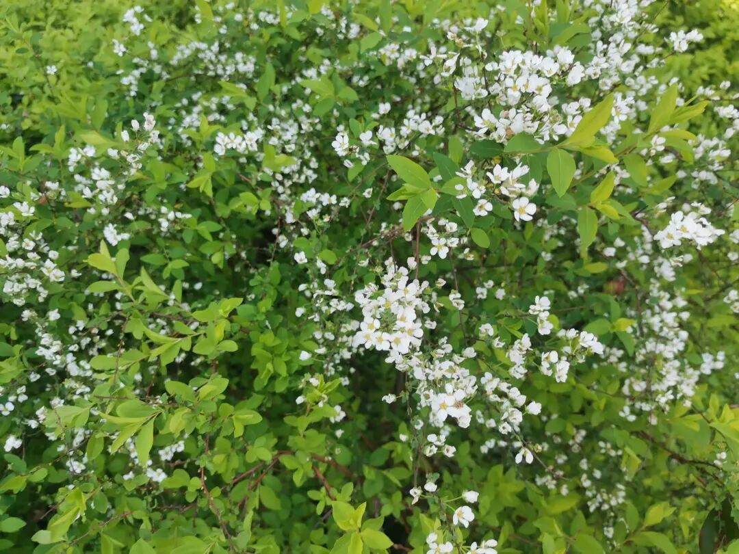 在绿化带内,还能看到了大红色的山茶花、白色的珍珠绣线菊和紫红色的红继木3种花卉。