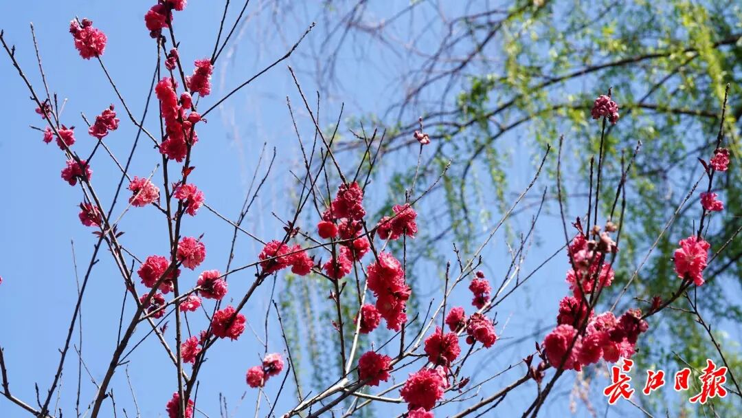 沿着带状公园往天鹅路方向继续前行,走不多远就看到几株红叶碧桃,颜色跟刚才看到的绚丽海棠差不多,但花型不同。水边一株高大的垂柳,长出新叶的柳丝随风飘荡,正好与桃花同框,形成“桃红柳绿”景致。