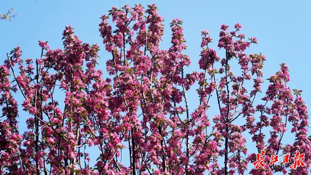 武昌区绿化队一位工作人员笑着提醒,这可不是桃花,而是绚丽海棠,为去年引进种植的新品种,武汉现在比较少见。近前一看,果见其花朵跟垂丝海棠和西府海棠相似,只不过颜色是大红色。