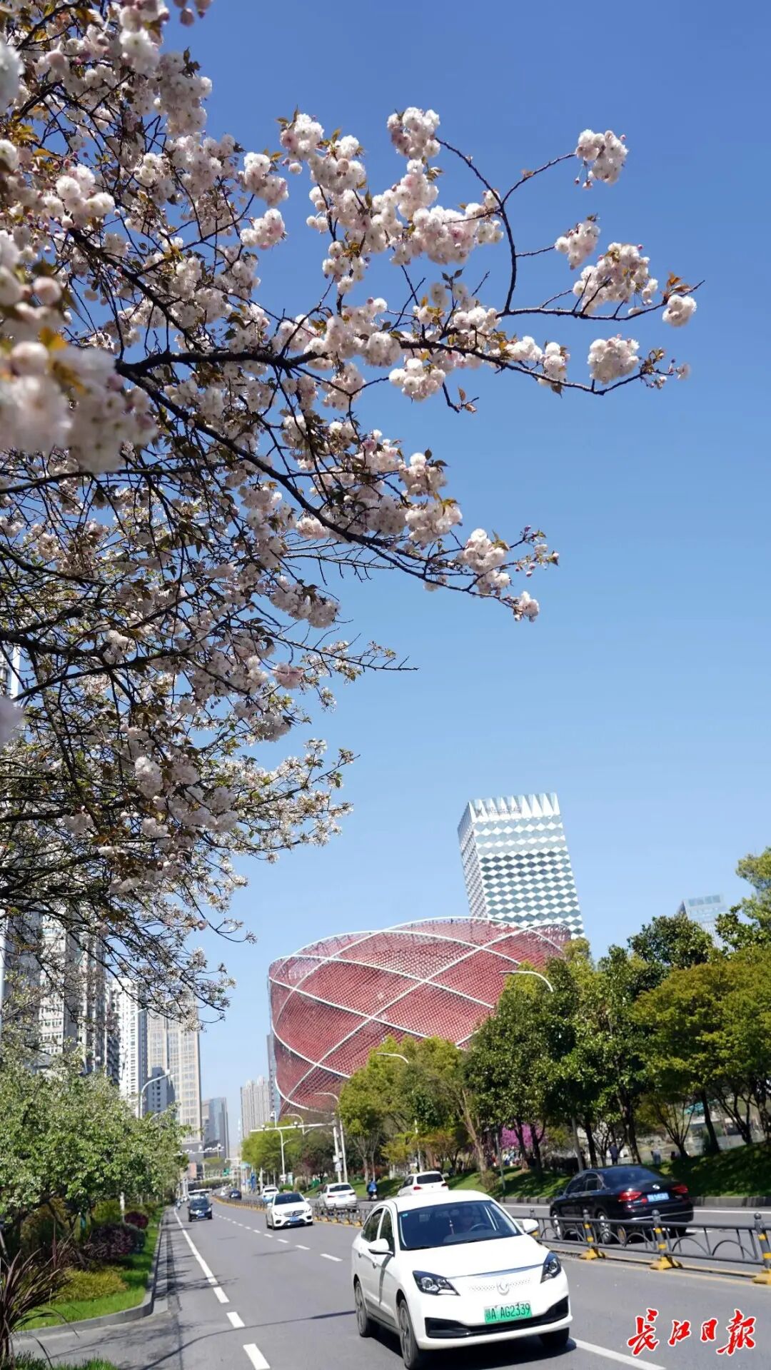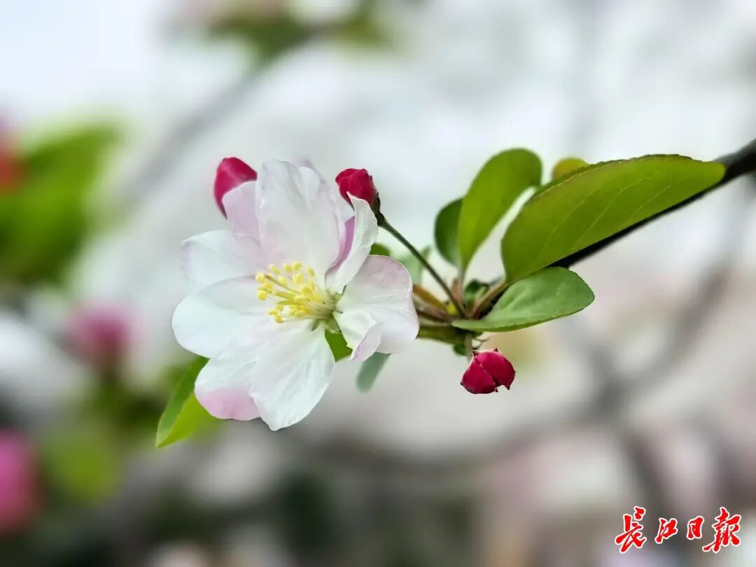 从地铁8号线水果湖站B出口出来,往左边一拐,沿着白鹭街前行一小段,可以看到左手边有一株西府海棠,花朵白中带粉,开得正艳。