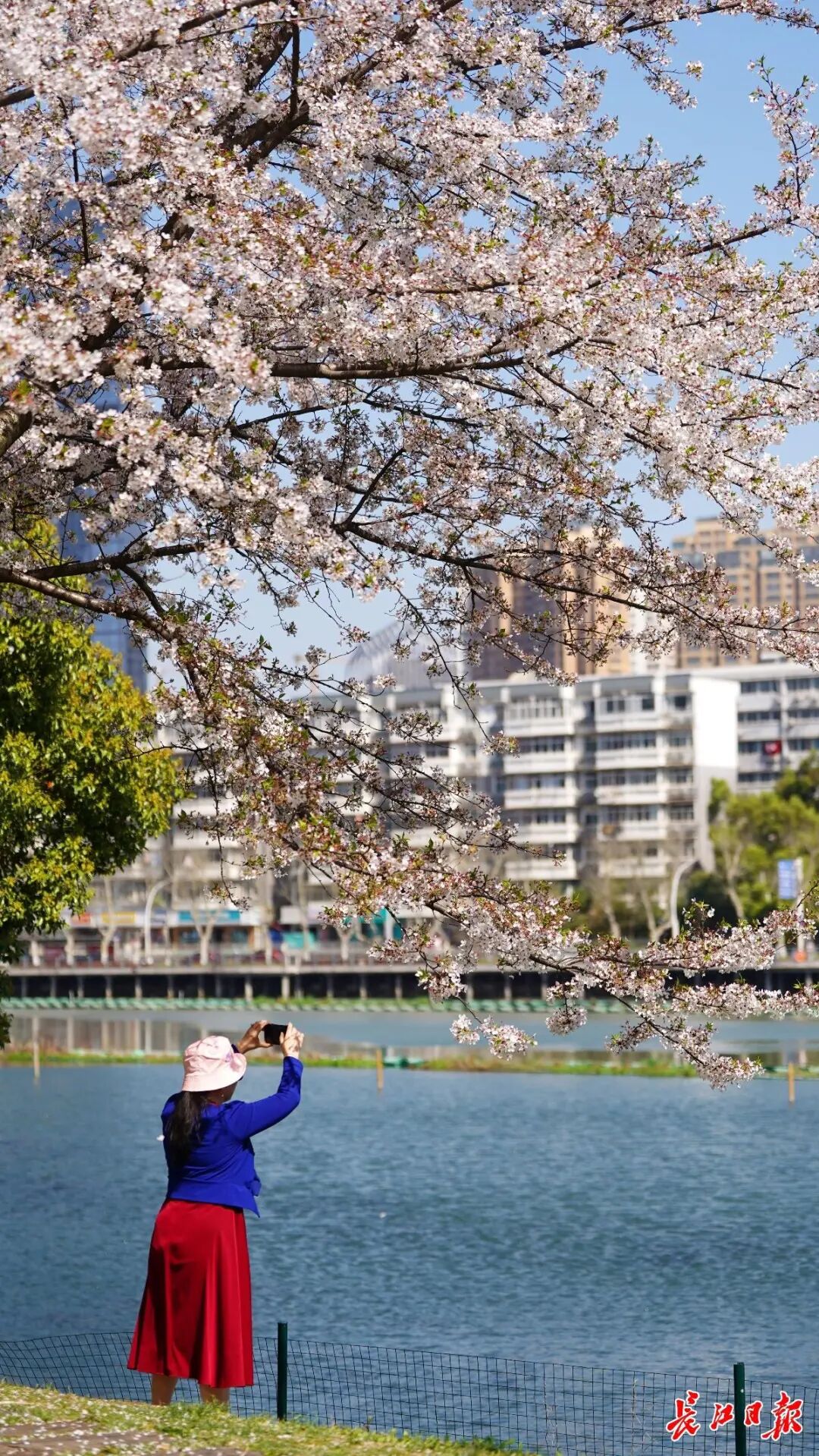 再往前走一段,可以看到水边有两株染井吉野樱,一株花期已近尾声,另一株开得正盛。一阵和风吹过,花瓣飘落如雪。来自广东佛山的游客曾女士正在树下拍照,她说:“武汉的樱花太美了!我要发朋友圈分享给所有的朋友。”