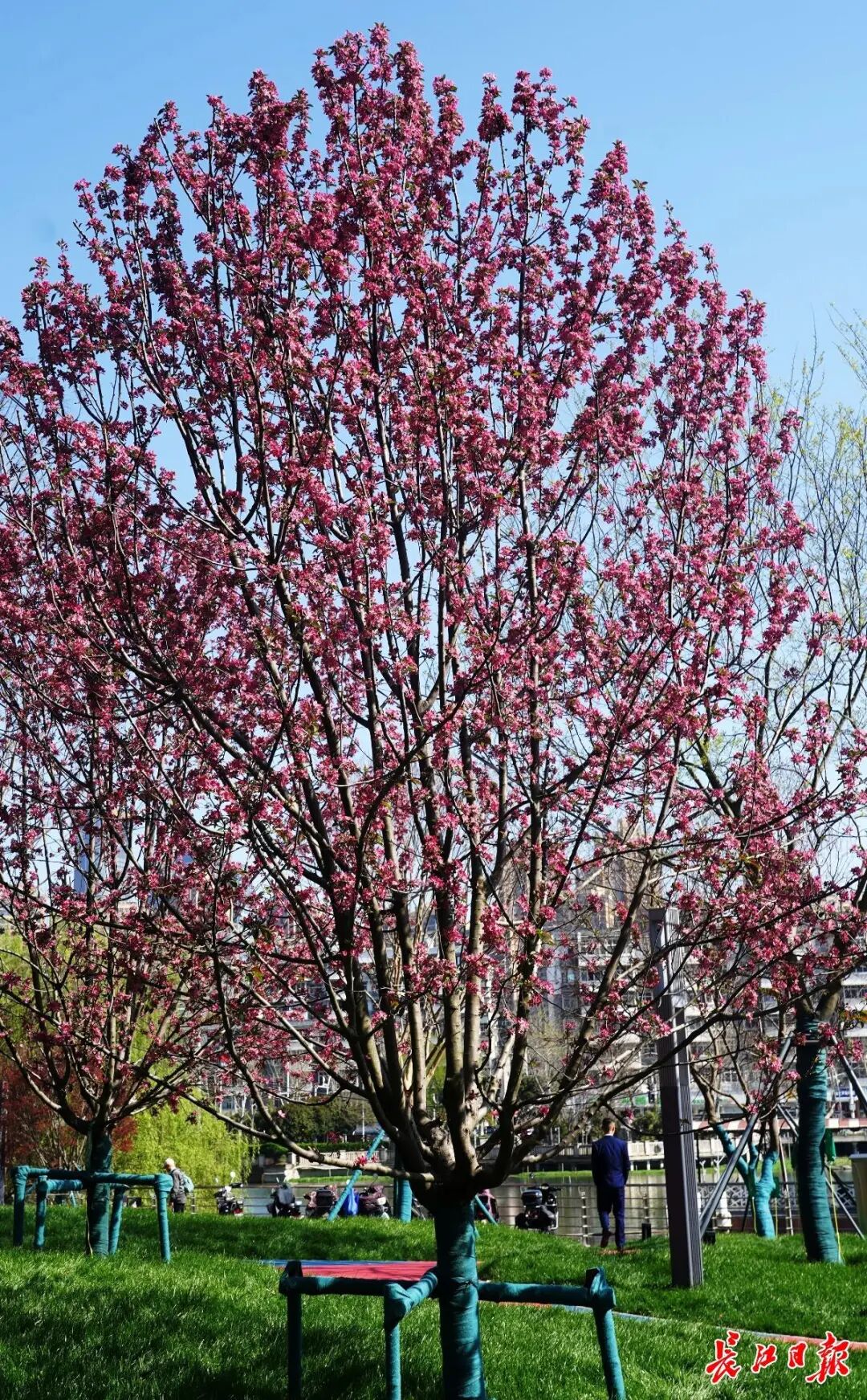 走到汉秀码头附近,可以看到临楚水有一个带状公园,这就是去年新建的汉秀口袋公园。公园内种有3株高三四米的花树,开满红色花朵。有路过的市民驻足观赏时称赞:“好漂亮的桃花!”