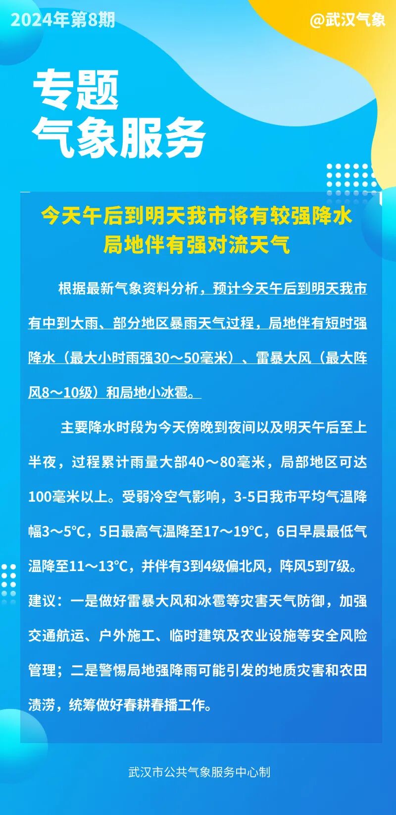 预计1-2日受高空槽和中低层切变影响,我市有较明显降水过程发生,伴有强对流天气;3-4日还有弱降水。此外2-4日受弱冷空气影响,我市北风稍有增强,气温略下降。