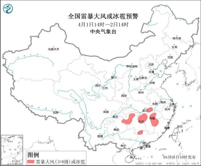 预计4月1日14时至2日14时,湖北东部、湖南中北部、江西中北部、贵州东北部等地的部分地区将有8-10级雷暴大风或冰雹天气,局地风力可达11级以上;安徽中南部、江苏中南部、湖北中东部、湖南中北部、江西、浙江西部、福建西部和沿海地区、重庆中部、贵州东部、云南西北部、广东北部等地的部分地区将有短时强降水天气,最大小时雨量30-50毫米,局地可达70毫米以上。