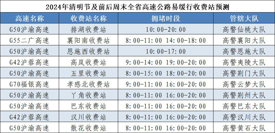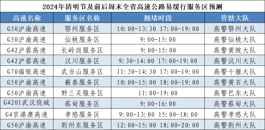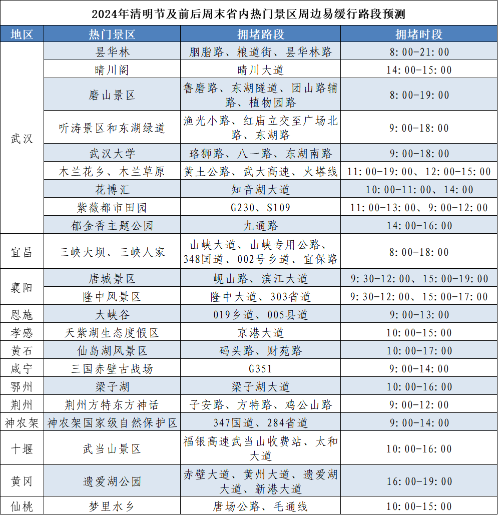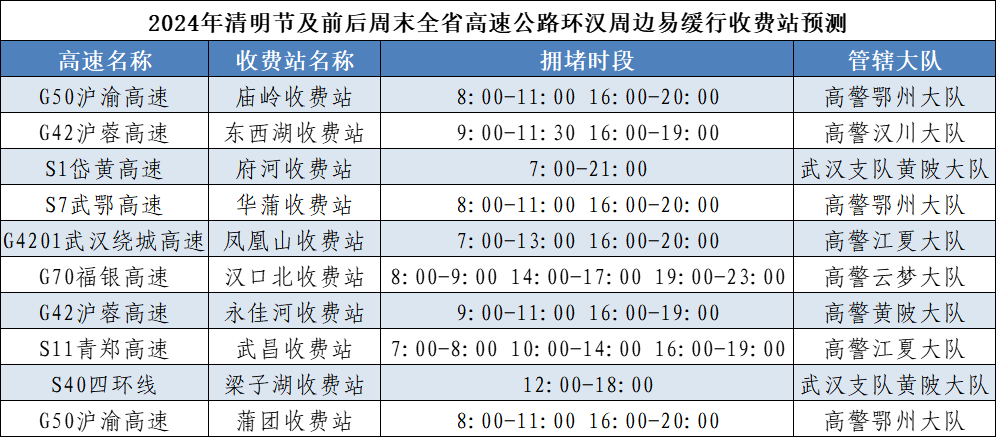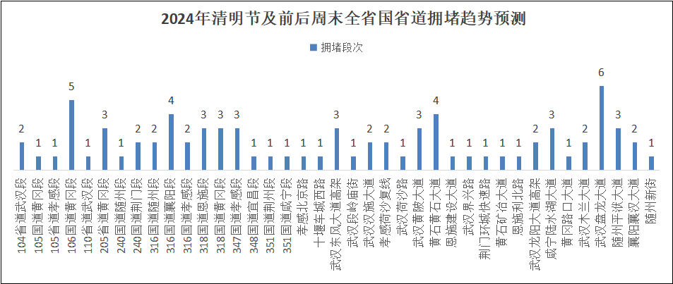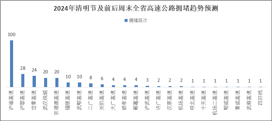 沪渝、沪蓉、岱黄、武汉绕城、京港澳、福银、武鄂、二广、关豹等高速路段拥堵风险高。