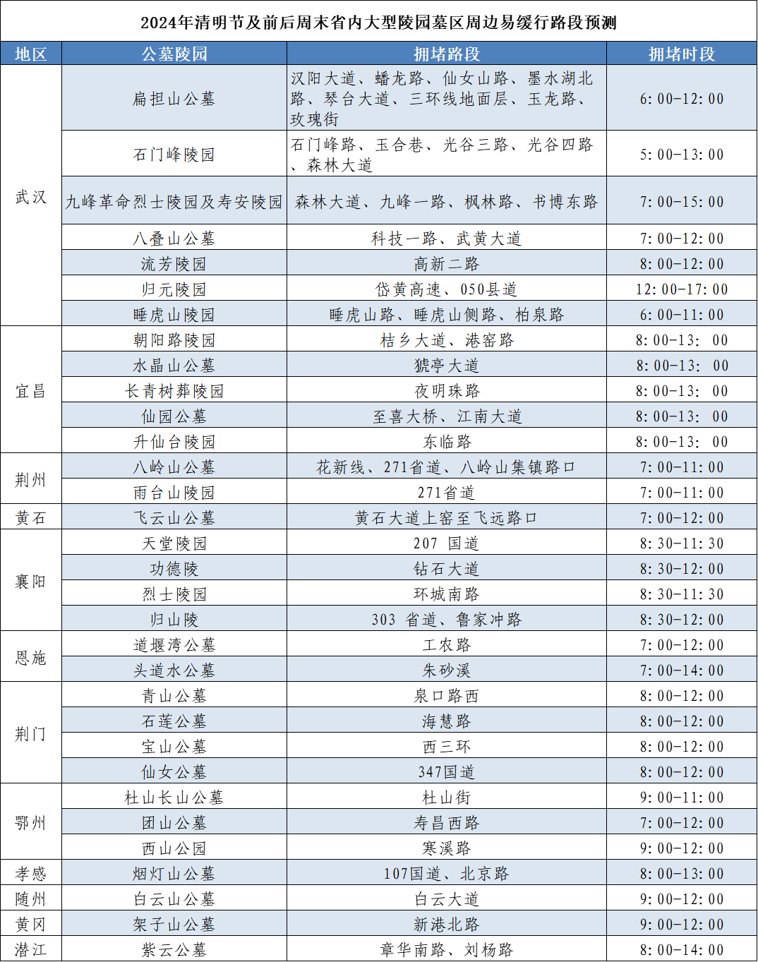 预计今年清明祭扫集中期(清明假期及前后周末),拥堵时段集中在每日7至10时、13至16时。