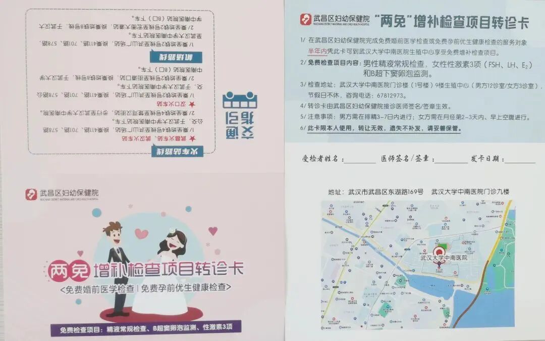 男女双方完成以上检查项目后,可以领取武汉大学中南医院转诊卡。凭卡可到武汉大学中南医院生殖中心(门诊楼9楼)免费做以下检查:男性精液常规,女性性激素3项(FSH、LH、E2)和B超下窦卵泡监测1次。