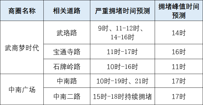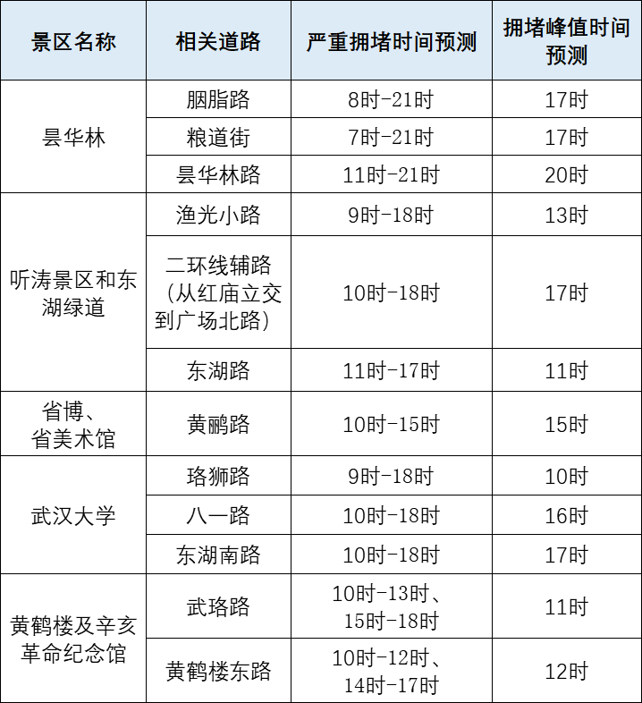 节日期间,东湖风景区、昙华林、武汉大学等区域最为热门。景区、公园周边堵点主要出现在人员进出口附近道路,容易出现拥堵。