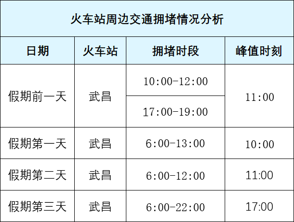 根据历史运行规律,武昌火车站的客流人数在假期前一天就开始增长甚至达到峰值,假期第二天和第三天相对分散。客运量激增,网约车、出租车将进一步聚集,武昌火车站周边道路交通压力将从假期开始前一天(4月3日,周三)交通压力开始增大,尤其是火车站停车场出入口所在道路将会出现拥堵情况。