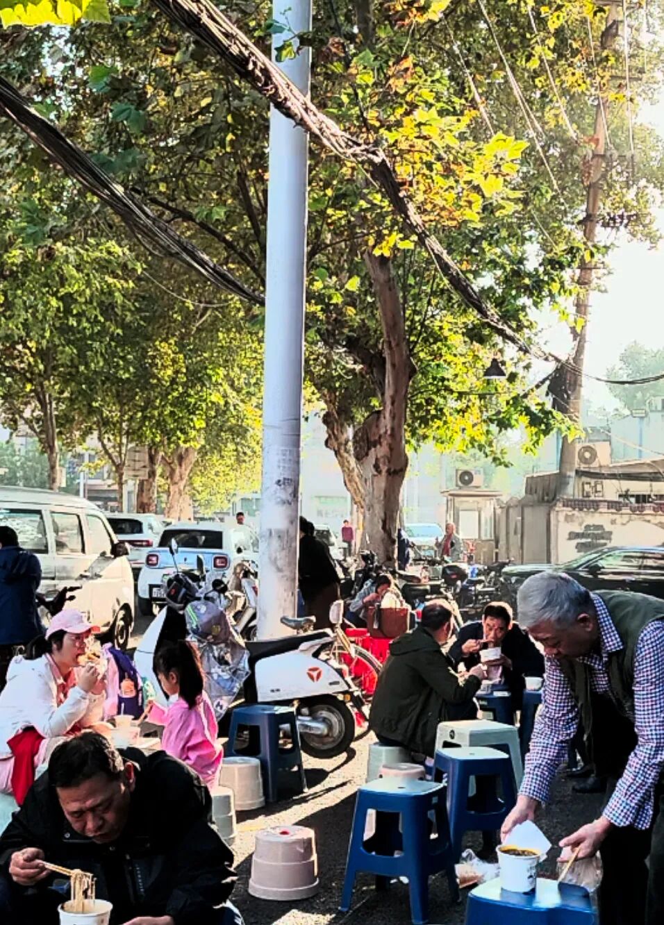 在这里显著的特点是,能感受到早点江湖里的粗狂,家家美食店周围都是高板凳、低板凳,店外永远比店内人多、热闹。