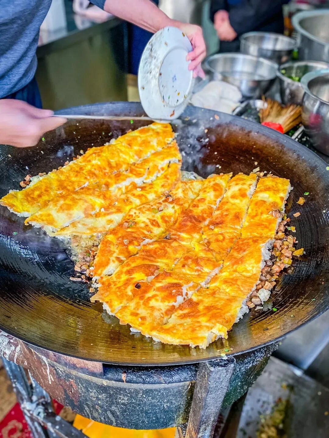 潇洒地转锅,抹匀蛋液,一把铁铲将馅料抹得均匀又讲究,仿佛做的不是豆皮,是艺术,卖的不是早餐,是情趣。