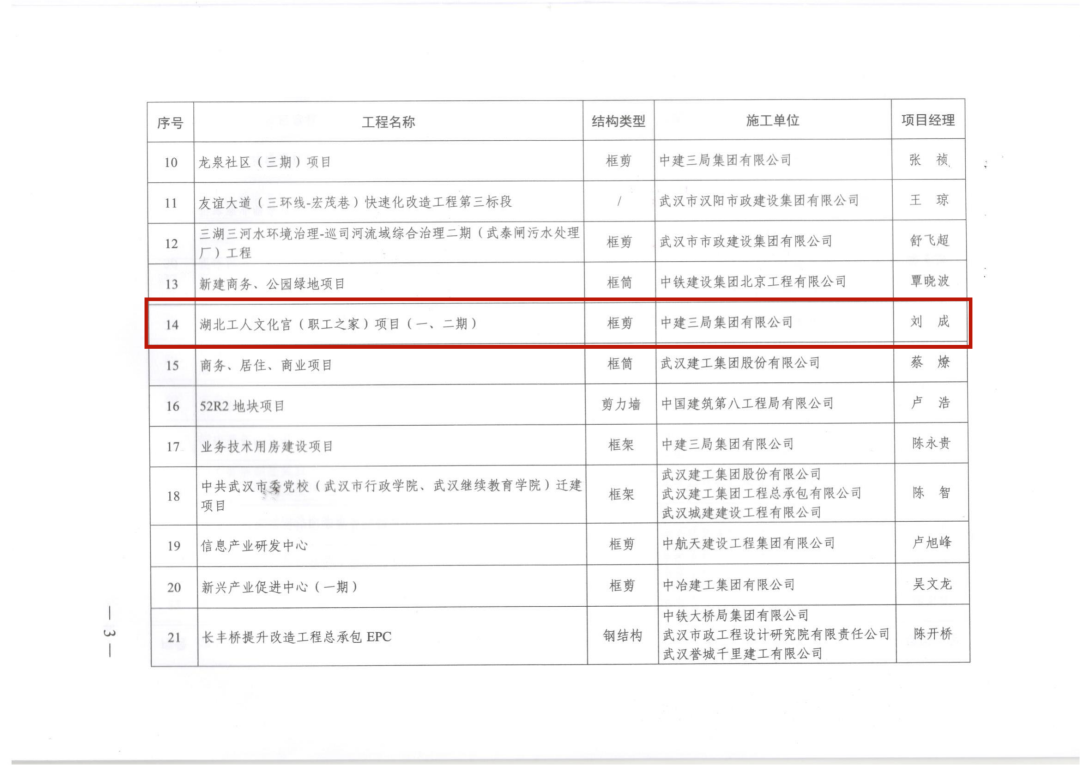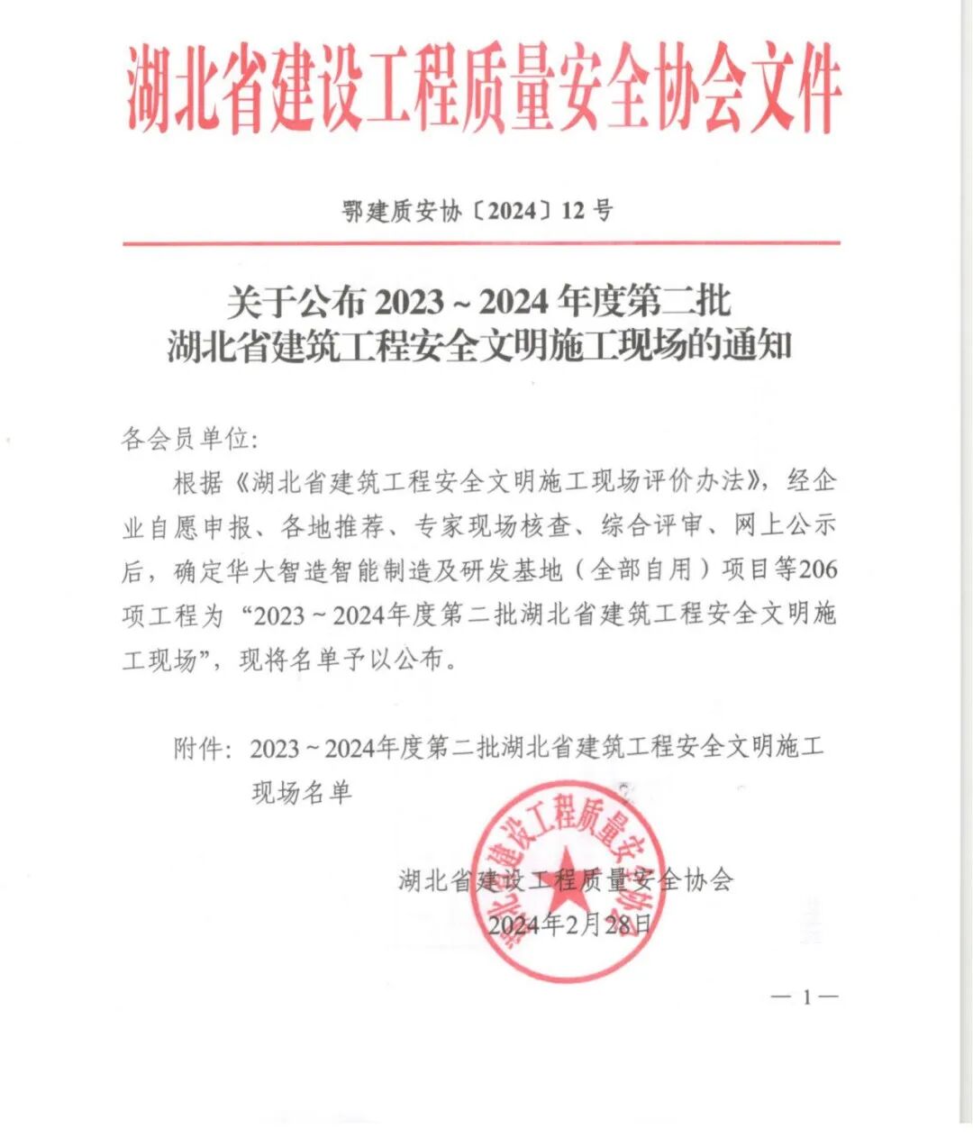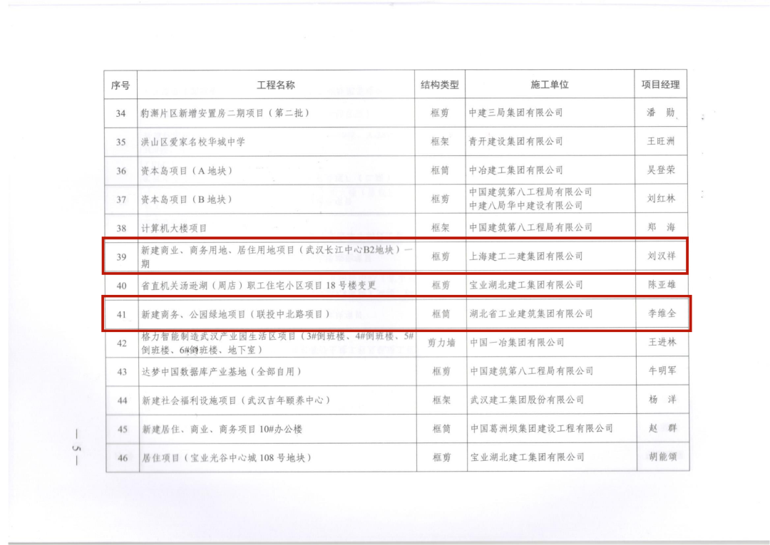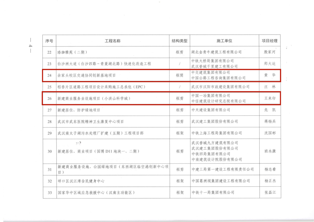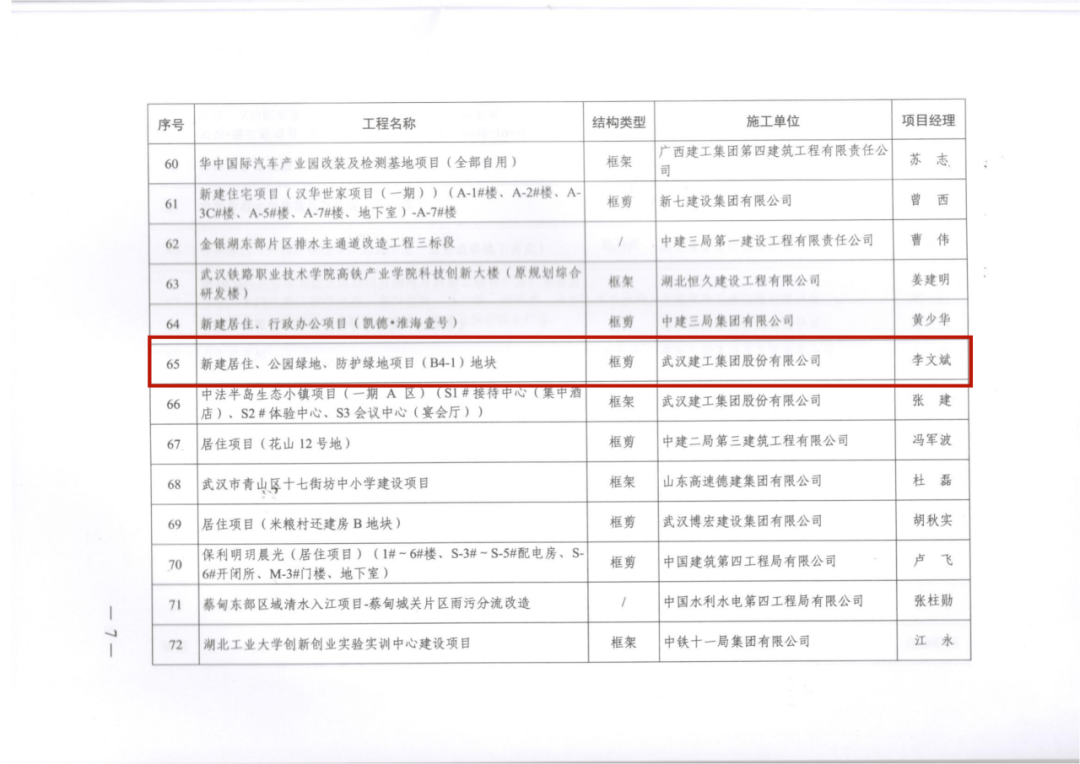 近日,武昌区小洪山科学城、余家头校区交通协同创新基地、武昌湾(B4—1)、湖北工人文化宫(职工之家)(一、二期)、武汉长江中心B2地块一期、联投中北路、武汉大学中南医院重大公共卫生应急储备大楼等7个项目,获评湖北省建设工程质量安全协会颁发的“2023—2024年度第二批湖北省建筑工程安全文明施工现场”称号。