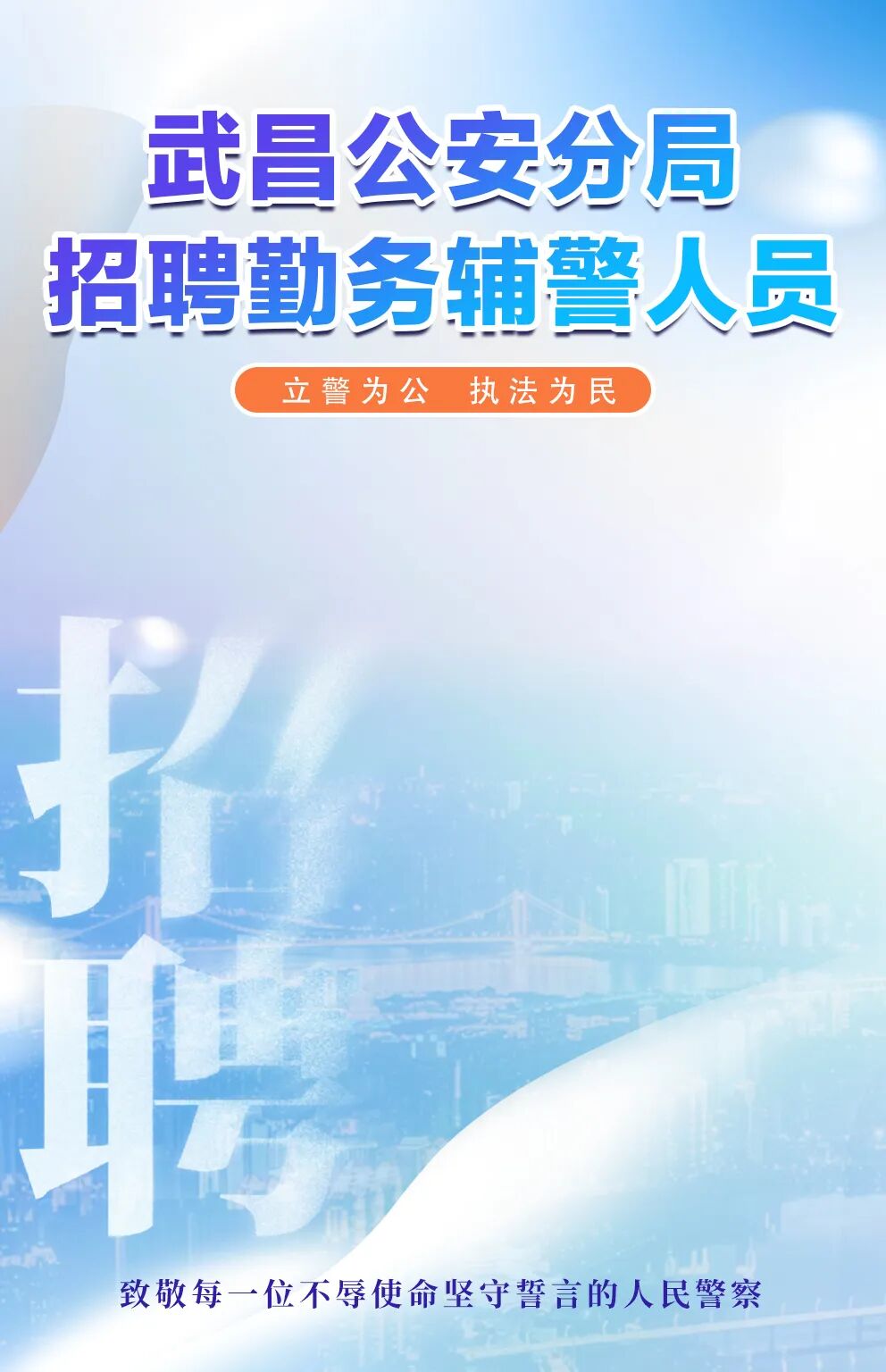 根据工作需要,武汉市公安局武昌区分局委托湖北纳杰人力资源有限公司,面向社会公开招聘30名勤务辅警,辅助交通民警开展路面执勤等相关警务工作,现将有关事项通告如下: