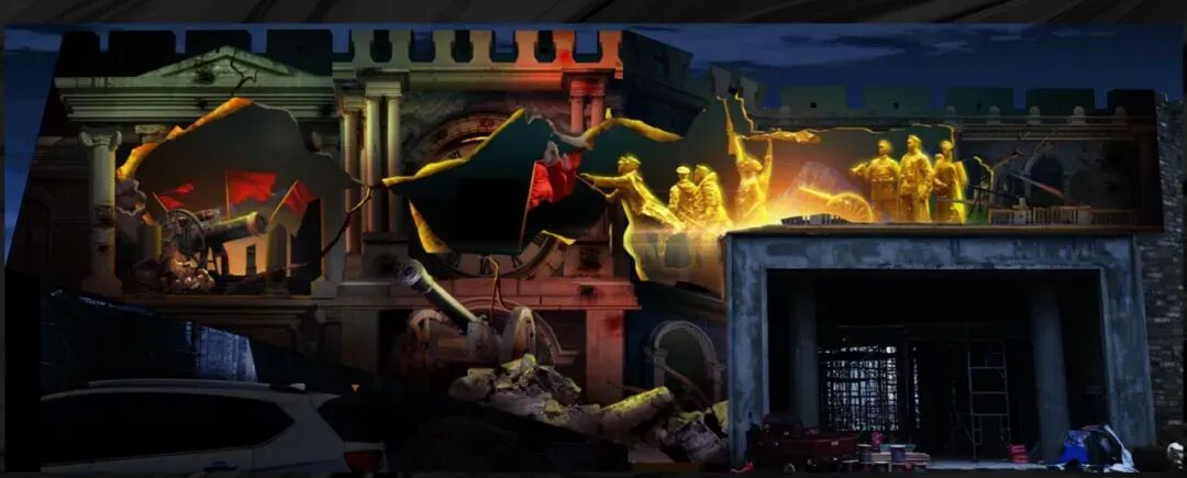 “武昌起义”时间点1911年10月10日的数字结构组成了起义战争的氛围环境。枪炮打在建筑上,石块碎裂,数字“3”显露出来。