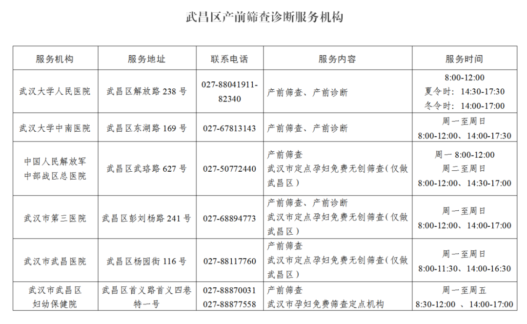 武昌区有产前诊断机构3家,产前筛查机构6家,其中开展武汉市孕妇免费无创筛查服务的定点机构4家。