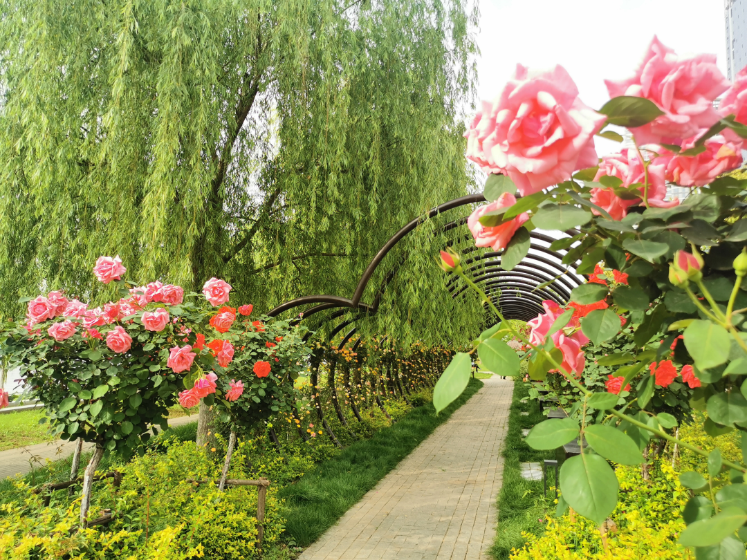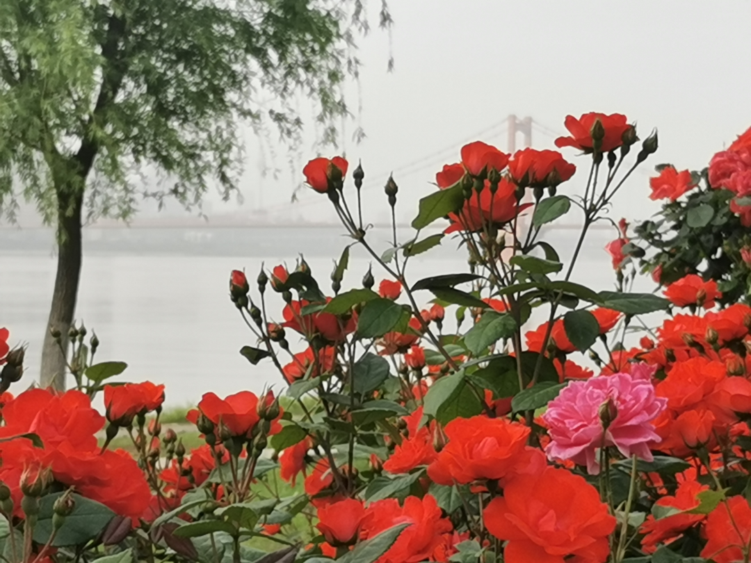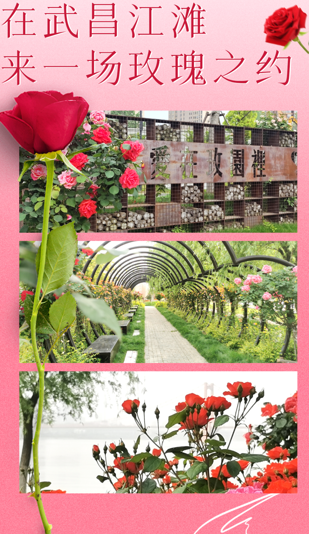 在武昌区八铺街江滩望江吧台区内坐落着一片爱情主题玫瑰园,当前玫瑰园里的玫瑰、月季盛开,鲜艳亮丽、热情似火,与豪迈的江水相映成趣,构成一幅生动的画卷。