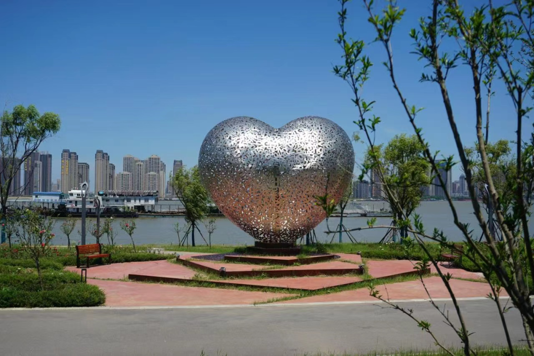 离玫瑰园不远处,园区里点缀着心型互动装置,心型廊架,心形雕塑等园林小品。在心形互动装置墙上印下幸福的印记,手牵手走在爬满蔷薇花的心型廊桥下,然后来到以红色钢塑玫瑰花底座撑起的镂空心形雕塑下,跟有着“西红柿鸡蛋”完美搭配称号的杨泗港长江大桥和鹦鹉洲长江大桥来一张绝美合影,这种体验真是浪漫无比。