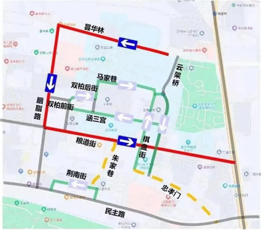 在昙华林(中医药大学-胭脂路)、胭脂路(昙华林-粮道街)、粮道街(胭脂路-中山路)采取逆时针单向通行的交通疏导措施。