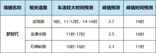 根据往年惯例,节假日期间,将会开展优惠促销活动,大型商场热度将在假期中上升。同时,预计大学生将成为各美食区域打卡主力军,区域周边道路人流、车流较大。预计梦时代及中南商圈周边道路,武珞路在9时、11-12时、14-16时车流较大,14时出现高峰;宝通寺路在11-17时车流较大,16时出现高峰;石牌岭路在10-16时车流较大,11时出现高峰。
