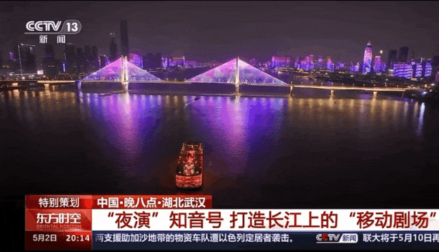 5月2日,《东方时空》五一特别策划“中国·晚八点”走进湖北武汉,聚焦武汉夜游。东方时空直播连线两江游览长达5分钟,带领全国人民沉浸式登船游江,感受武汉浪漫之夜。