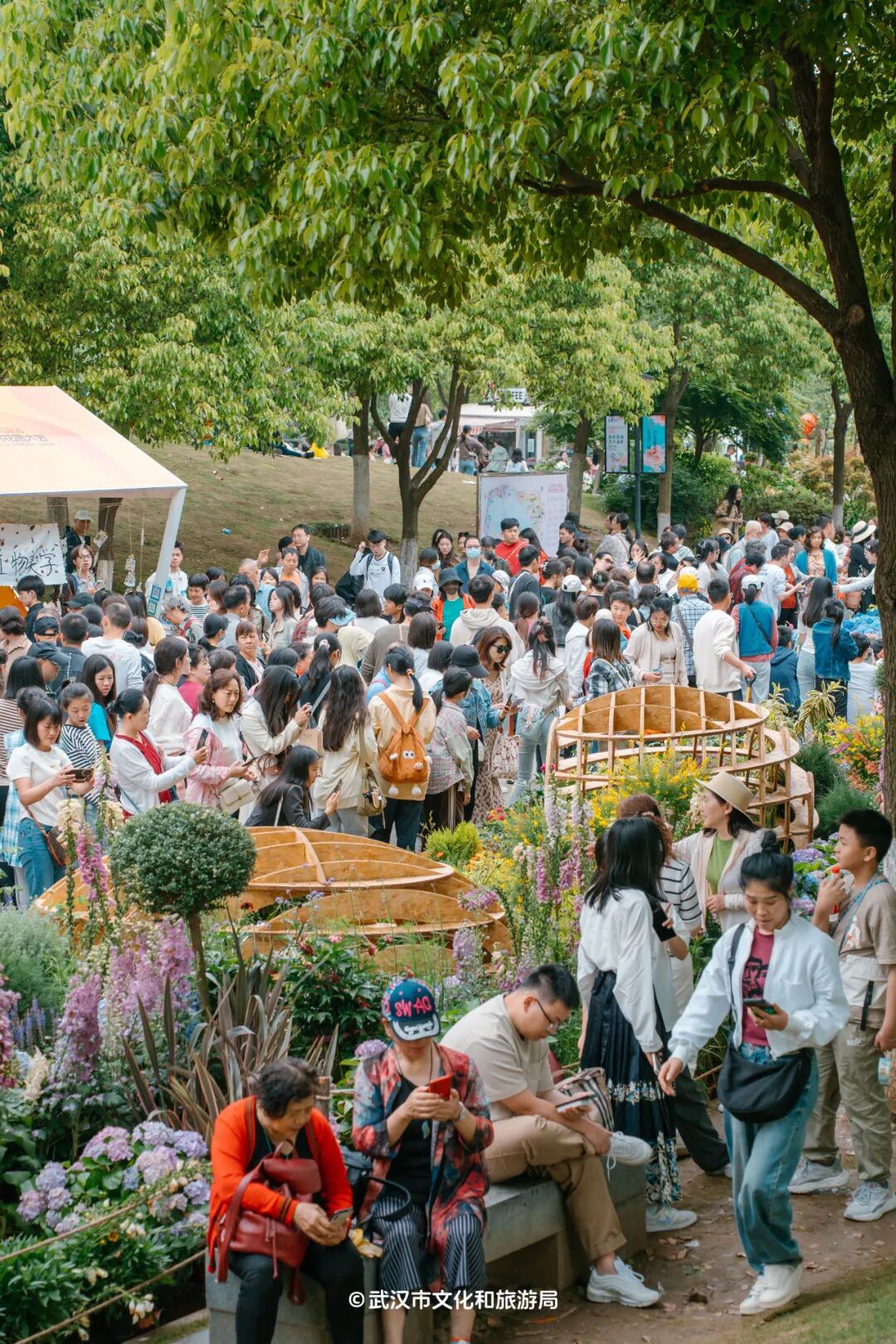 因为沙湖公园C区是「世界花园大会」武汉分会场的举办地,1000多种鲜花入园造景,早上八点多,展区里已经人挤人,花海与人海齐绽放。