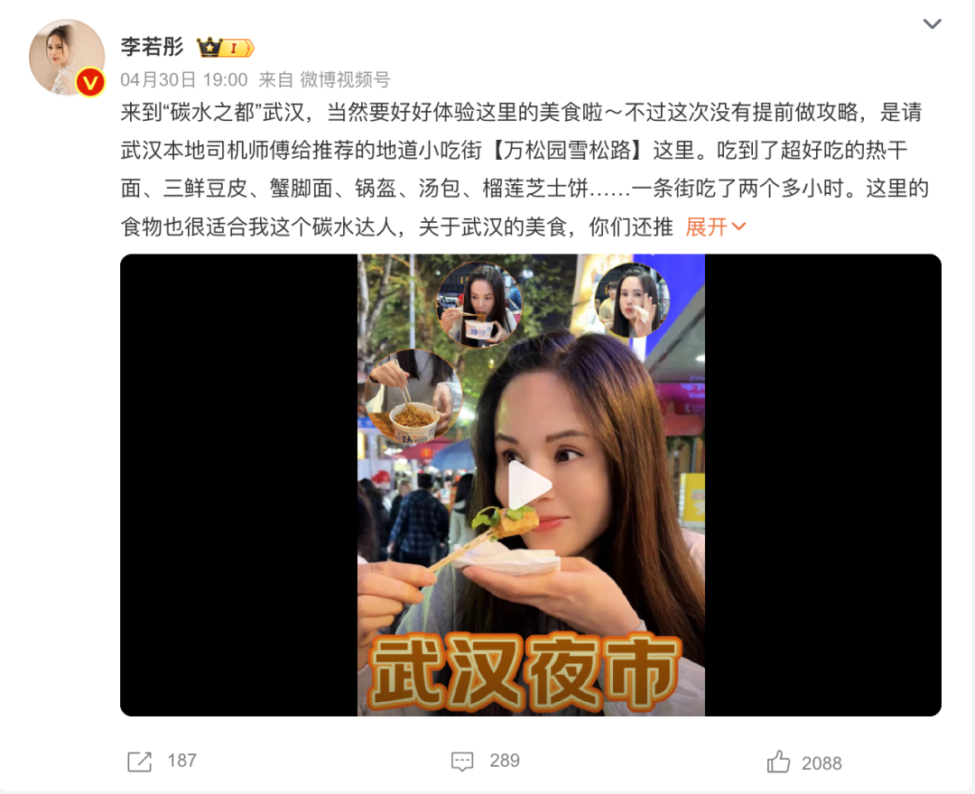 “小龙女”李若彤也来武汉了!受司机师傅的推荐,她抵达万松园,一进去就逛吃了两个多小时。