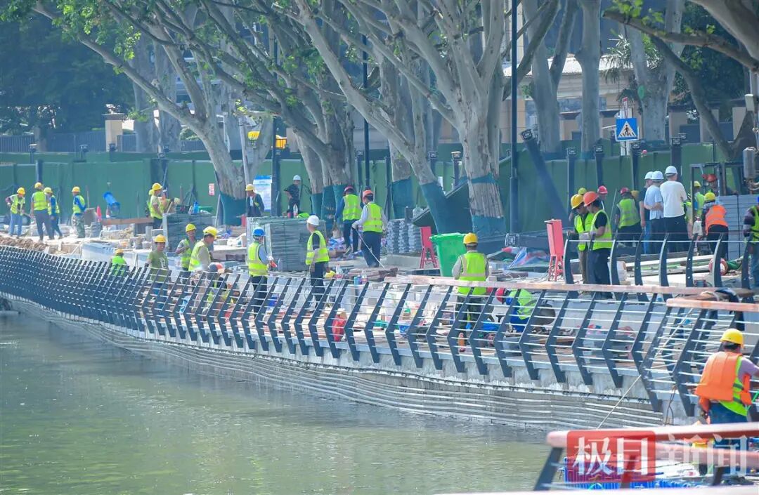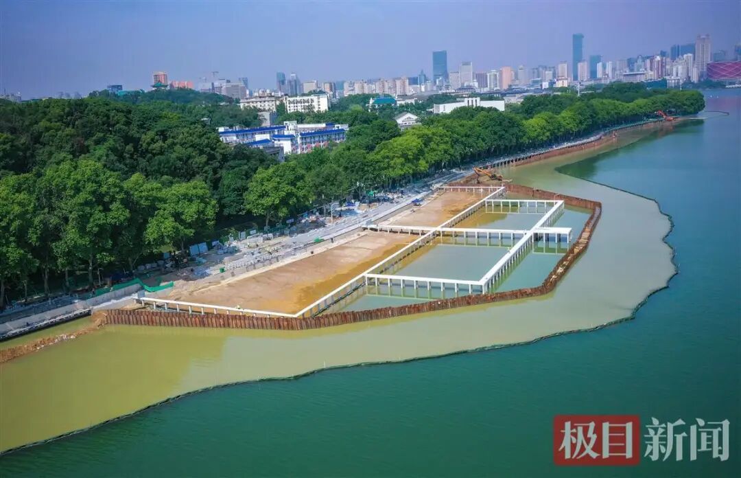 凌波门栈桥的桥墩和桥体已经搭建完成,临湖的亲水平台也进行了拓宽。
