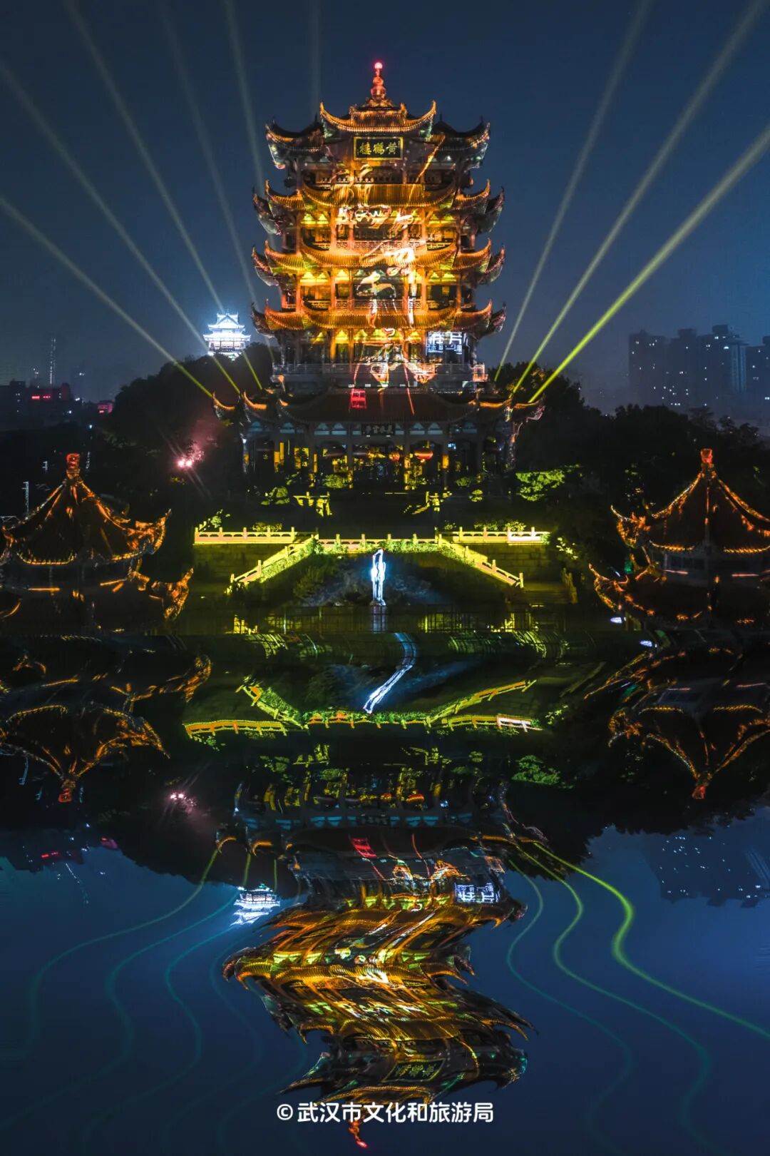 当夜色降临,黄鹤楼化身巨型光影幕布,展示炫酷灯光秀。