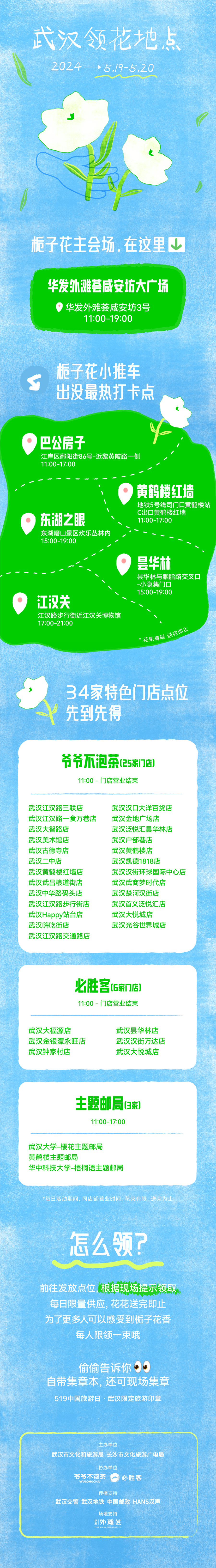 与此同时,武汉欢乐谷、武汉天地45家商户、6家today今天便利店,明天开始接力送花。未来半个月,还将有更多企业加入“送武汉人栀子花”活动。