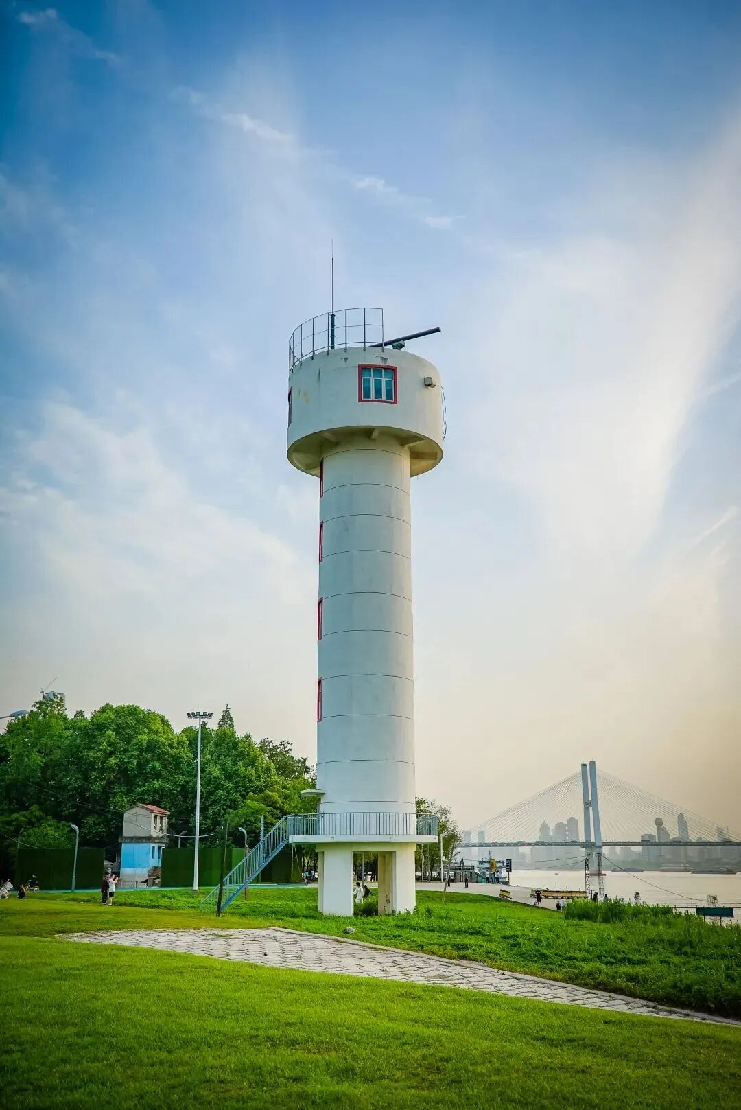 汽渡码头入口处,江堤边伫立着一座白色灯塔,它是长江的航标,它的主要作用是让航行在长江的船舶在数公里之外就能看到码头的位置,是助航长江的重要标志。无论时空如何转换,江河不老,航标便不能倒。通体雪白的灯塔,自带清新浪漫的气息,而它的永恒坚守,也正契合了人们对爱情的期许,与白塔一同入画,让它见证你与爱人执子之手、与子偕老的承诺。
