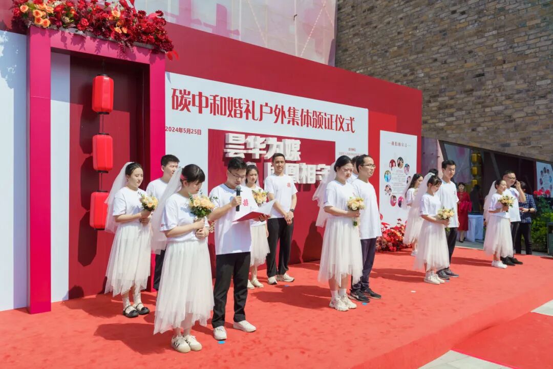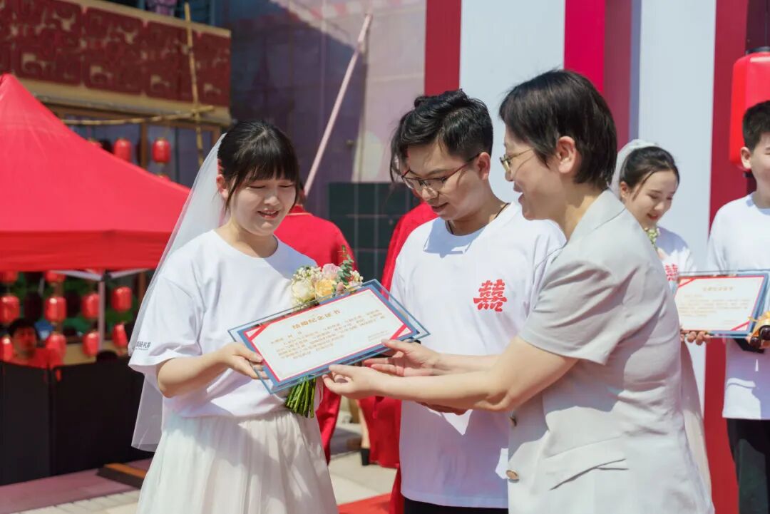 活动现场,来自各行各业的8对新人在亲朋好友和游客们的见证下,携手挚爱来到“昙华为媒 凤凰相守”碳中和主题户外颁证点,在武昌古城墙的见证下,开启新的幸福人生旅程。