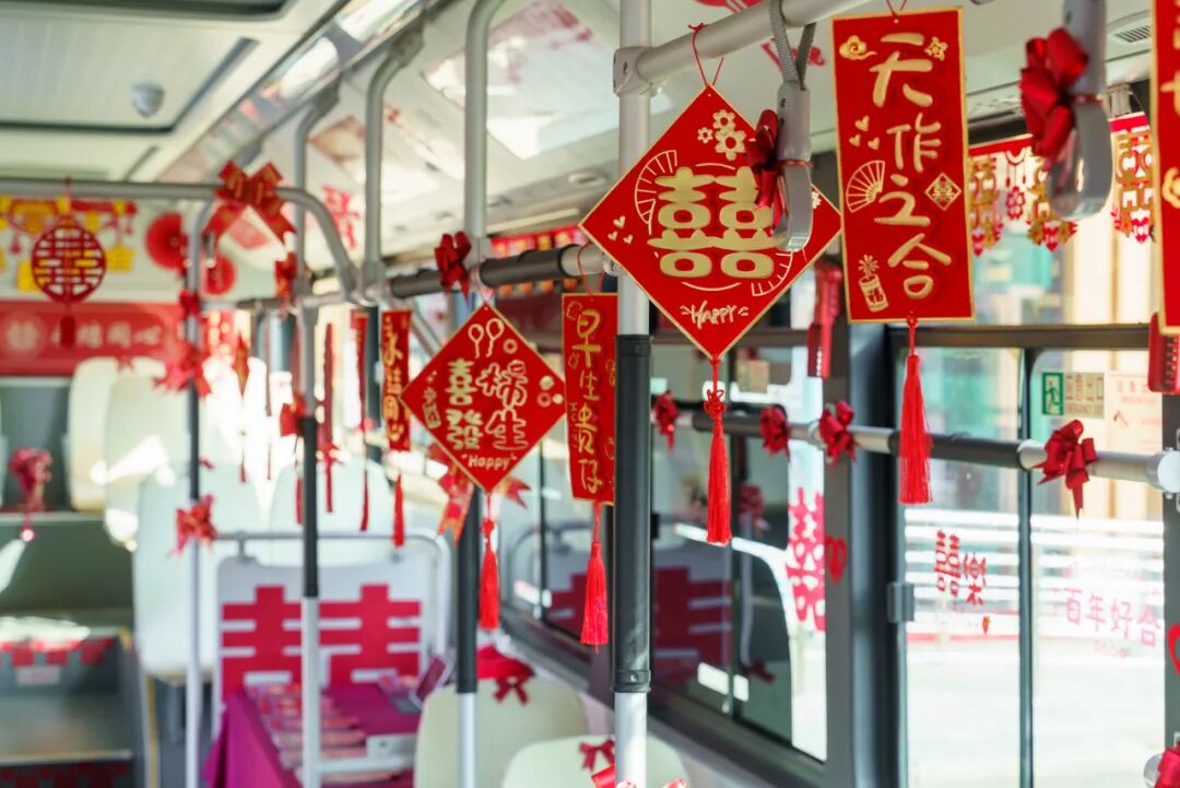 仪式结束后,新人们统一乘坐“幸福号”新能源公交婚车前往餐厅,与亲朋好友们一起共进自助式婚宴。