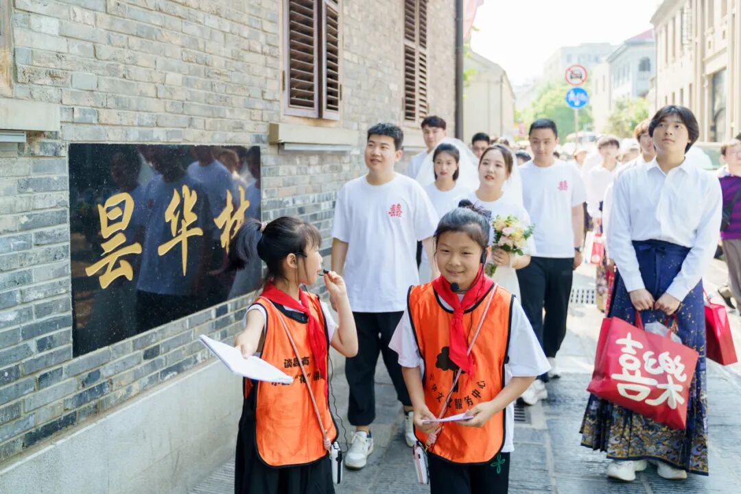 粮道街“小昙花讲解员”为身着“囍”字T恤的新人们引路,沿途为大家讲解昙华林的非遗文化和特色景点,让大家切身感受到昙华林的历史文化魅力。