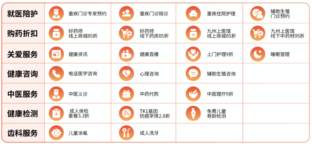 “福汉康”为被保险人提供七大类23+健康管理服务,涵盖口腔、看病、买药等多项福利