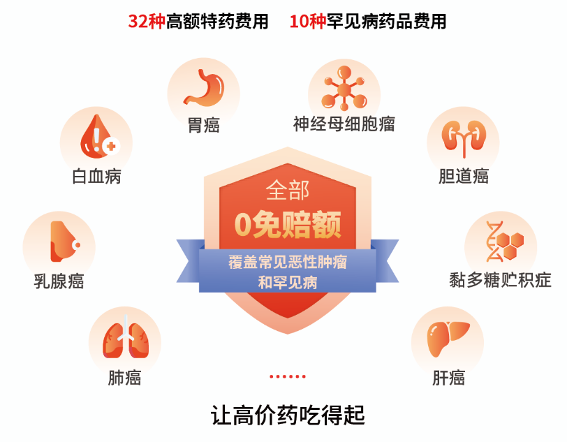 32种高额特药费用、10种罕见病药品费用全部0免赔额,覆盖常见恶性肿瘤等重大疾病。