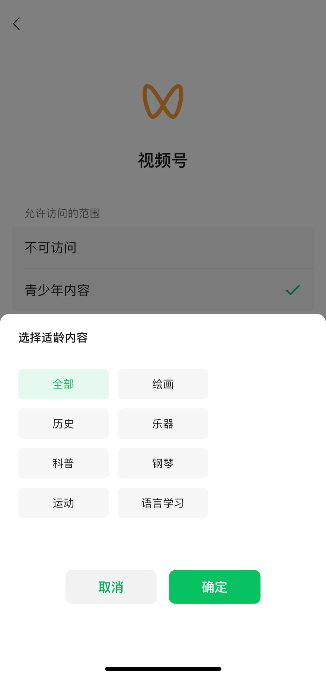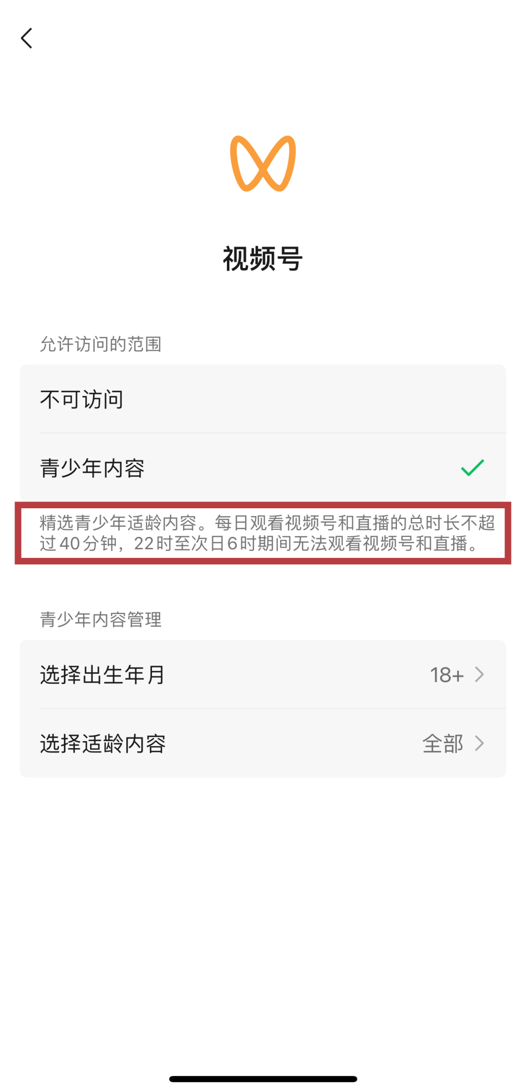 青少年模式下,家长可设置视频号不可访问,或者允许访问青少年内容。额外设置“出生年月”“适龄内容”后,可定向获取更适合的内容推荐。