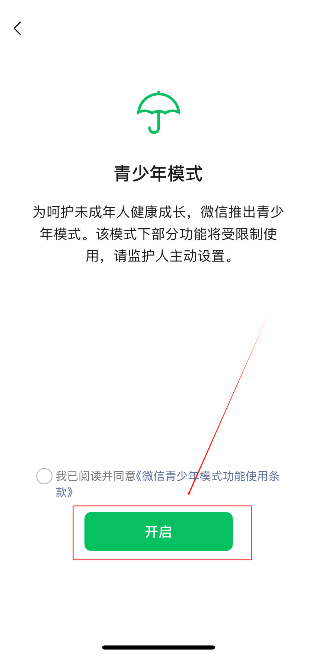 打开手机桌面的微信App,点击右下角的“我”,点击界面底部的“设置”选项,点击“青少年模式”选项,勾选“微信青少年模式功能使用条款”后,点击界面底部的“开启”选项。