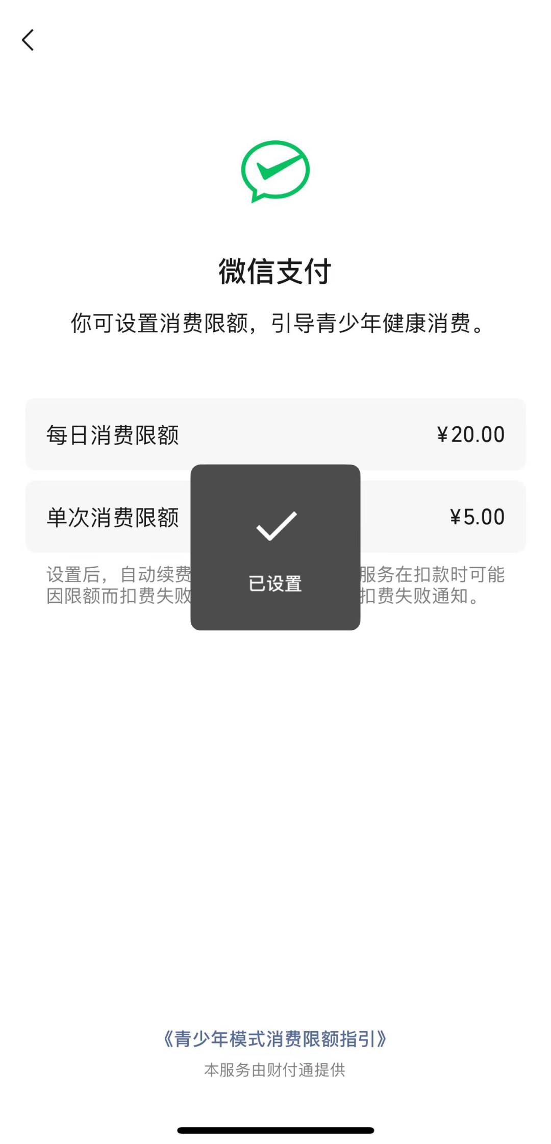 父母或监护人可以在青少年模式中设置微信支付的限额,包括“每日消费限额”和“单次消费限额”。完成设置后,青少年使用微信支付时将会受到已设置的额度限制。