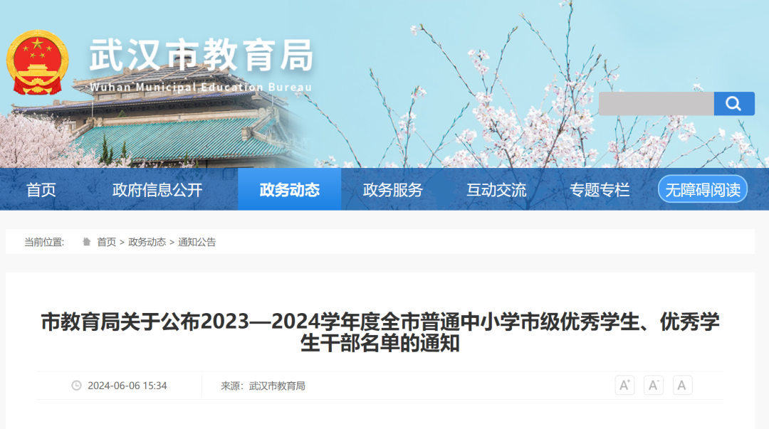经中小学民主推荐,市、区教育局审核,社会公示,市教育局决定授予江岸区一元路小学二(4)班刘函宇等3799名学生“2023—2024学年度武汉市普通中小学优秀学生”称号,授予市解放中学七(9)班刘珮渔等813名学生“2023—2024学年度武汉市普通中小学优秀学生干部”称号。