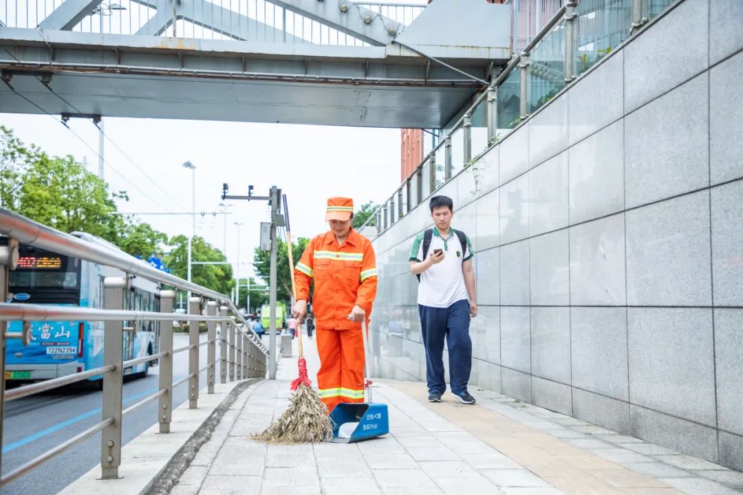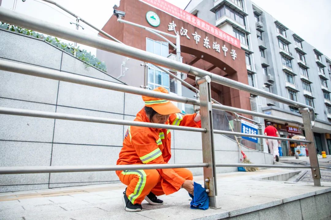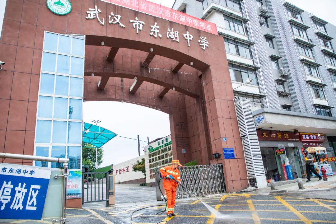 东湖中学考点外,武昌区城管执法局二桥清洁队所有机械车辆绕开考场区域,临近考点处全部采用人工作业,并开启全程静音作业模式,做到轻扫、轻洗、轻运,努力降低噪音对考生的影响。