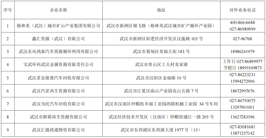 必须在取得正规资质的企业报废旧车才可申领补贴,企业均可提供上门收车、手续代办服务。武汉市有资质的报废车企业信息如下: