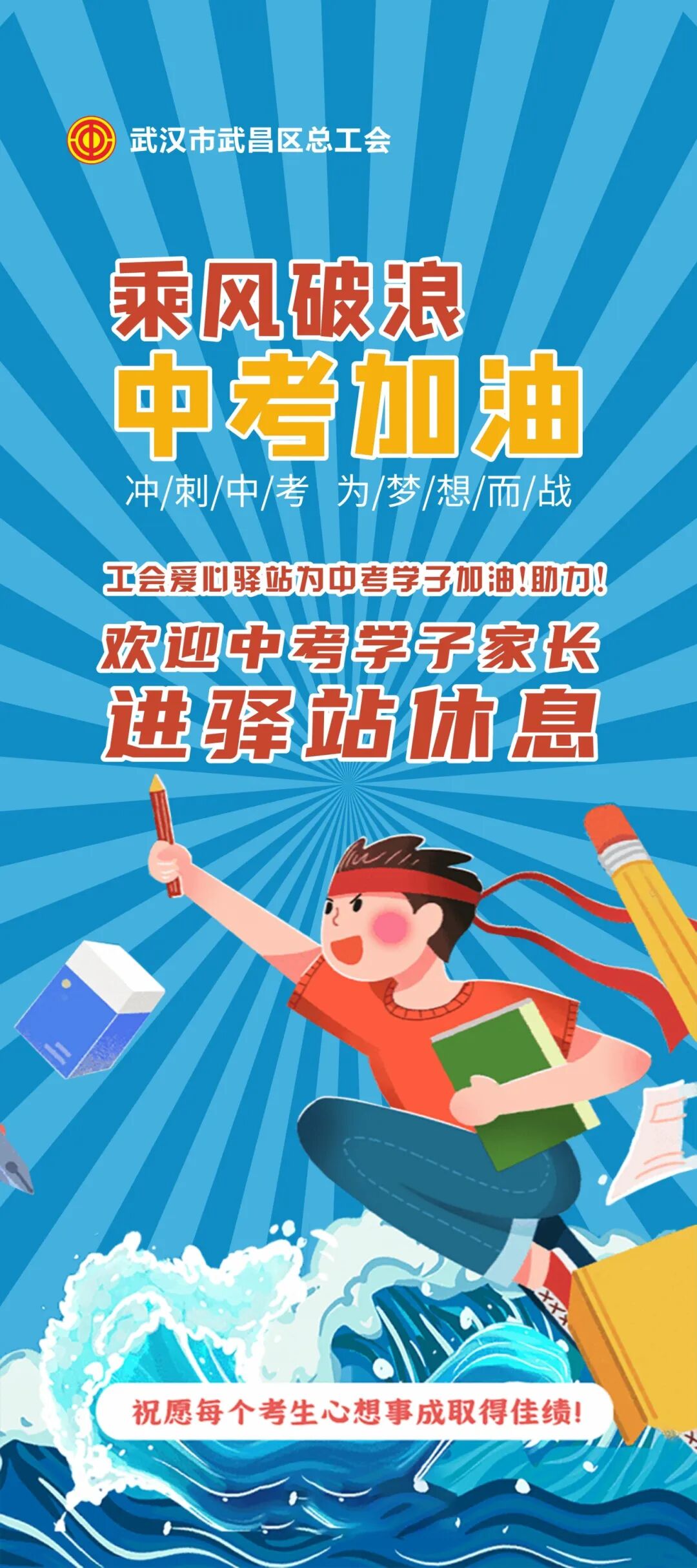 乘风破浪,中考加油!为进一步发挥工会组织优势,帮助解决考生家长候考的现实需求,武昌区总工会将在中考期间免费开放工会服务阵地,让工会驿站秒变“考点候考站”,用实际行动助力中考,为广大考生及家长营造一个轻松、舒适、便捷的考试环境。