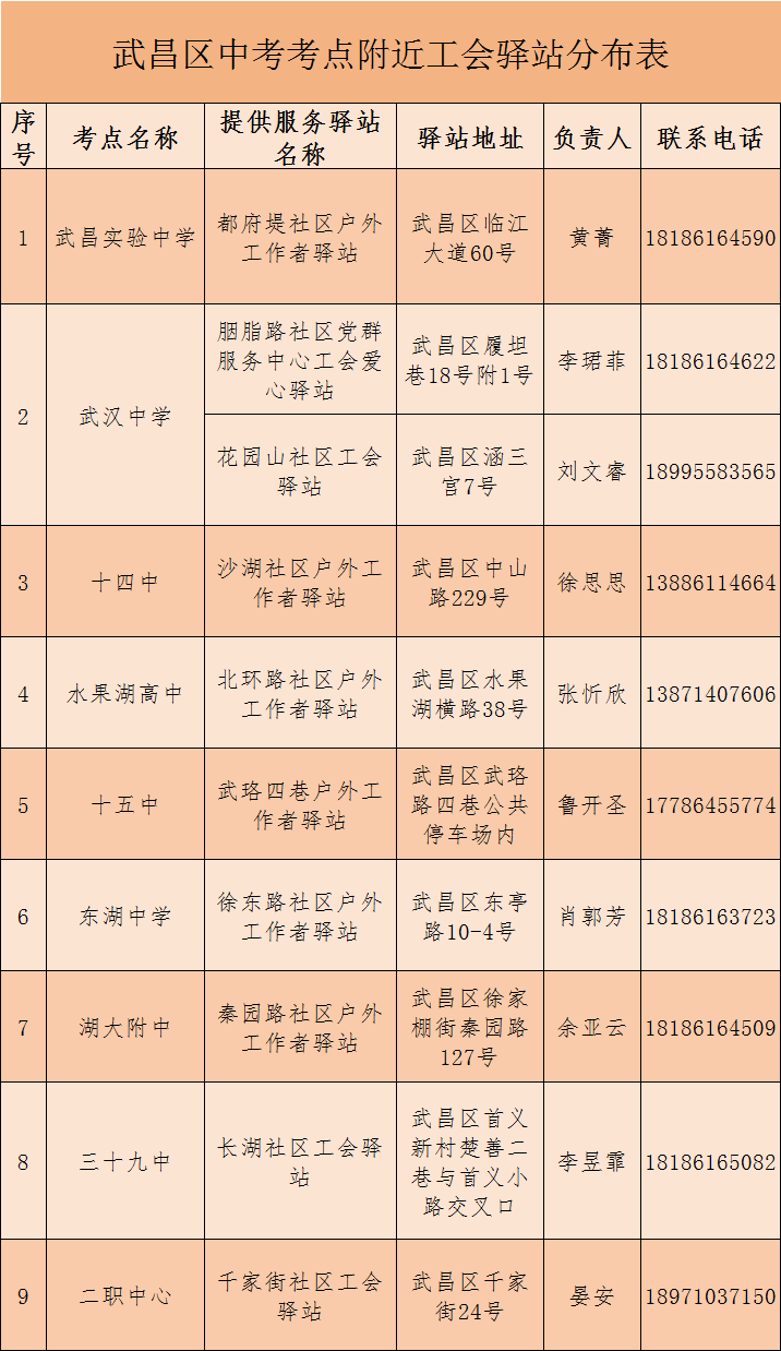 中考期间,武昌区总工会将免费开放以下10个离考点最近的工会驿站(详情附后),考生及家长也可以通过高德地图搜索“工会驿站”,即可查询到考点附近的工会驿站具体位置,欢迎考生家长进驿站休息,享受工会服务。