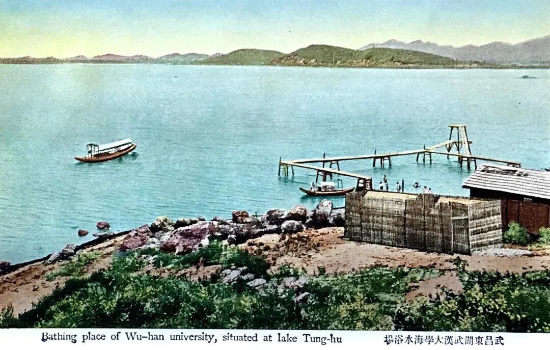 这是一张上世纪30年代的明信片,名为“武昌武汉大学海水浴场”。