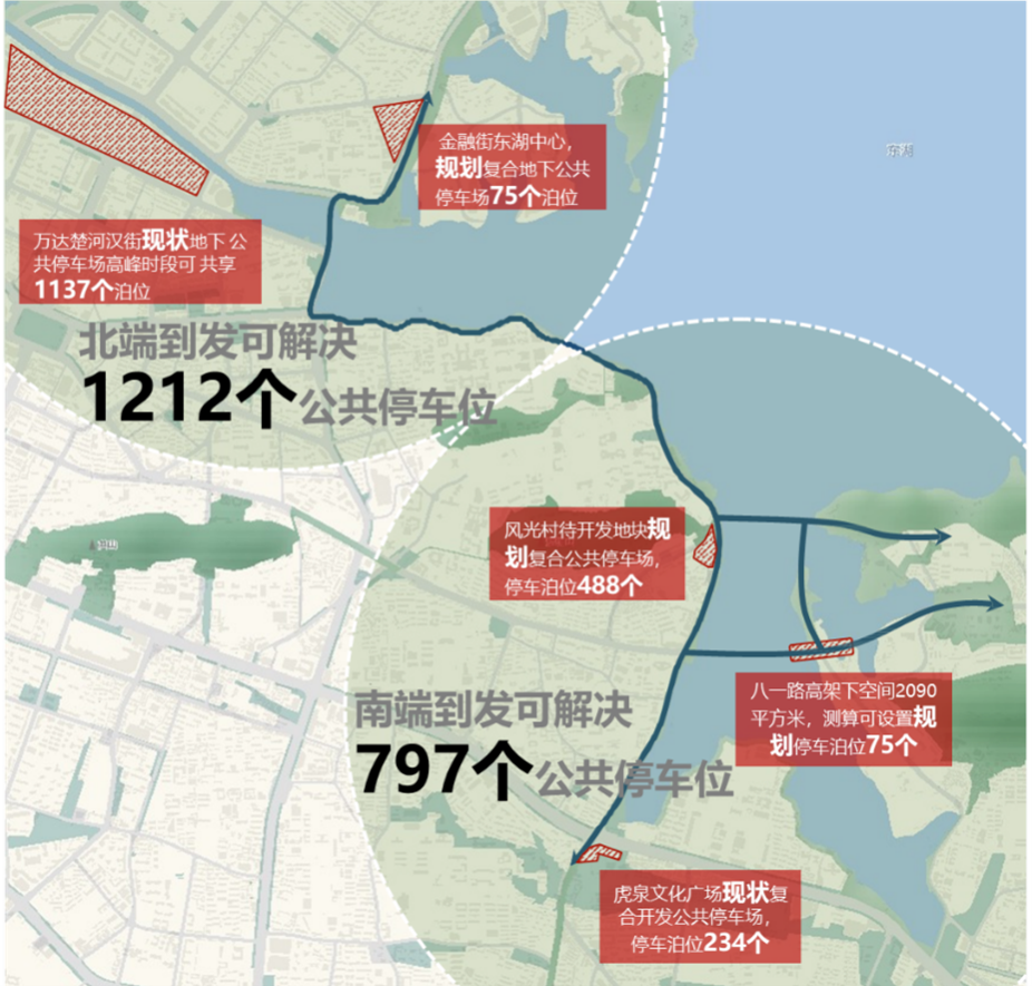 建议游客在汉街、金融街东湖中心等周边停车场停车,然后通过公交、骑行、步行等方式到达绿道。